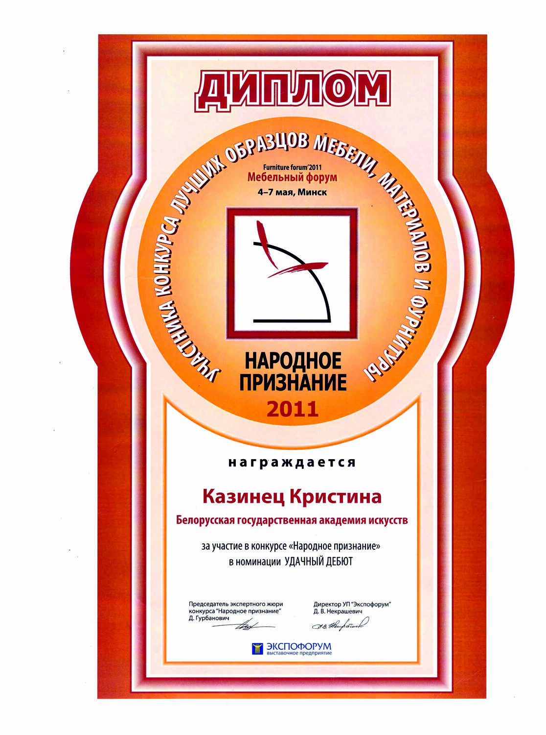На протяжении учебы в БГАИ участвовала в мебельных выставках (форумах) г. Москвы и г. Минска. На одной из выставок был получен диплом «Народное признание» в номинации «Удачный дебют» (2011г.)