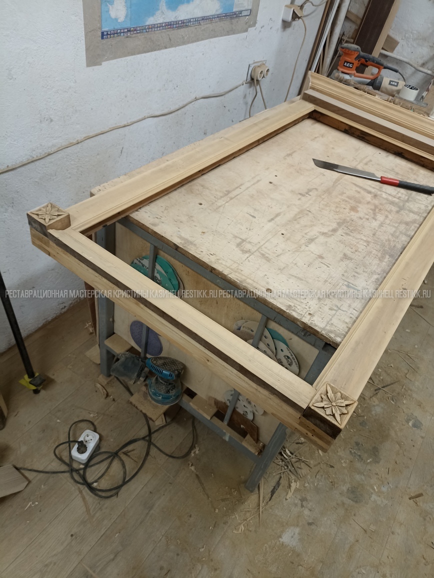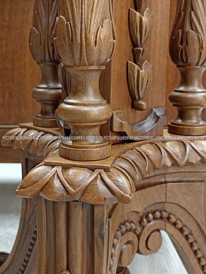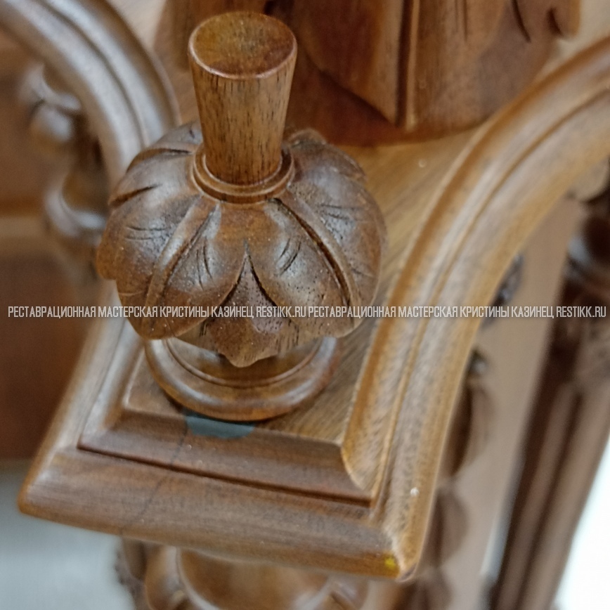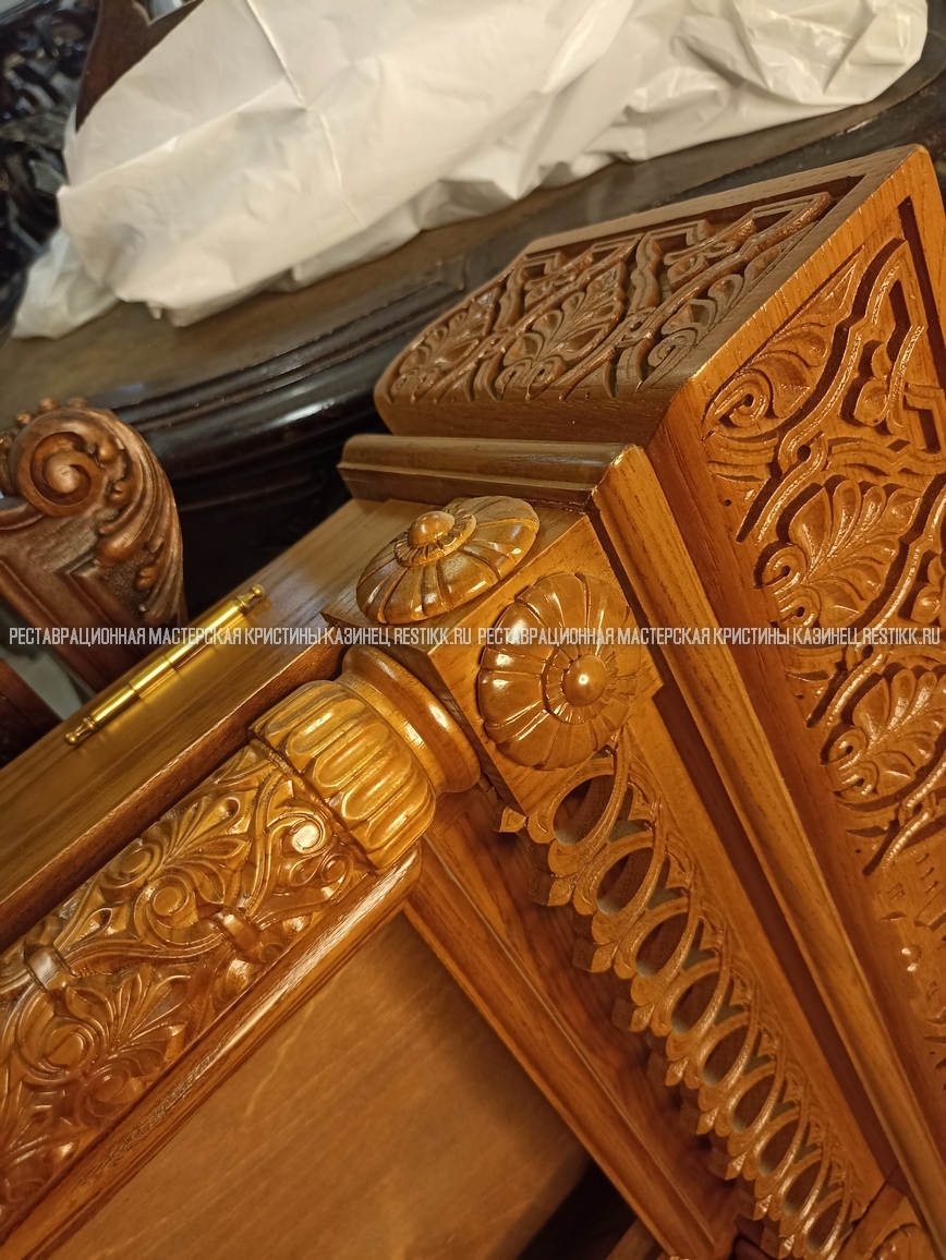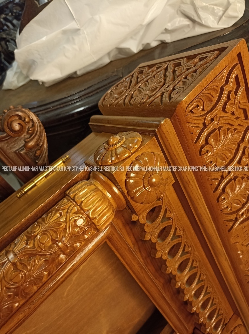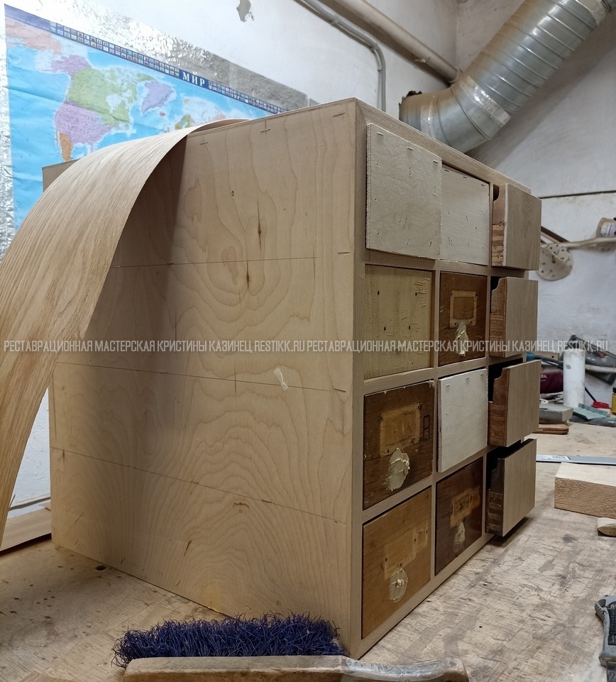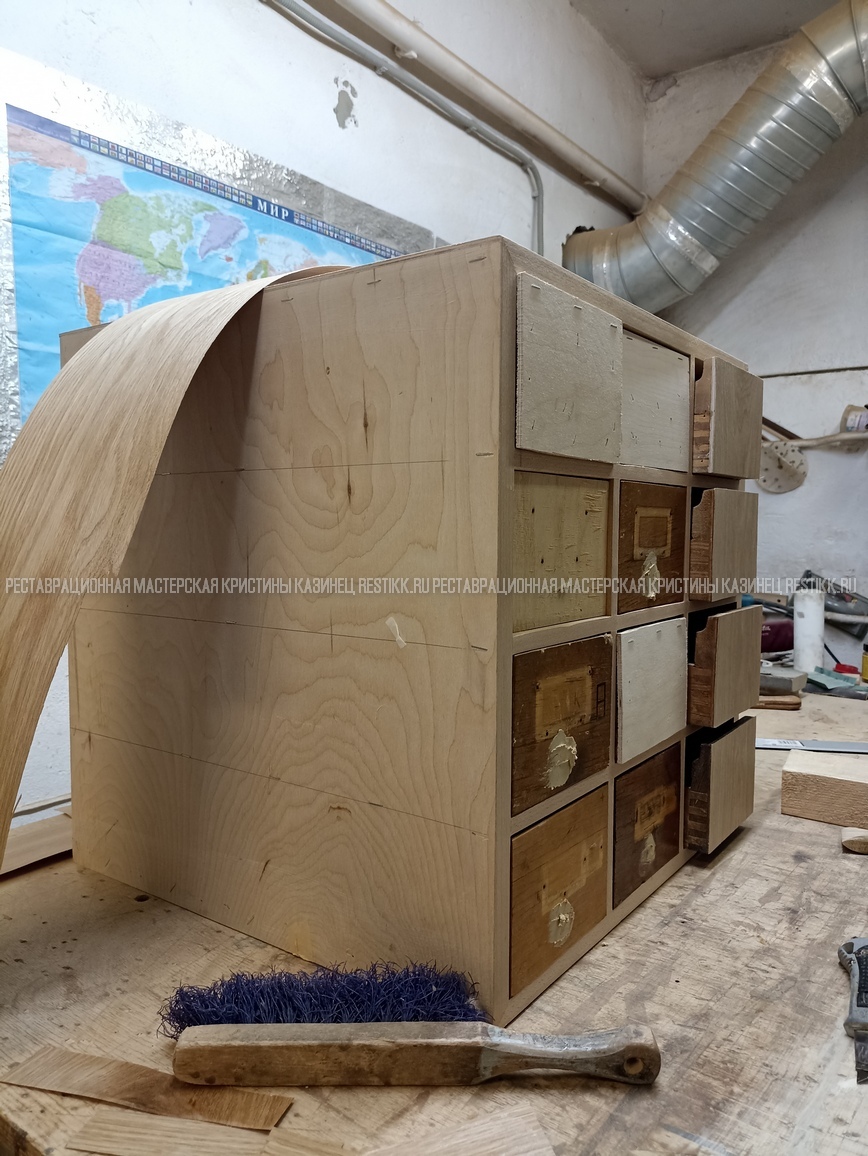 Старый шпон повсеместно отслаивался, сохранить его было невозможно. Поэтому работа предполагала полную перефанеровку всех плоскостей.