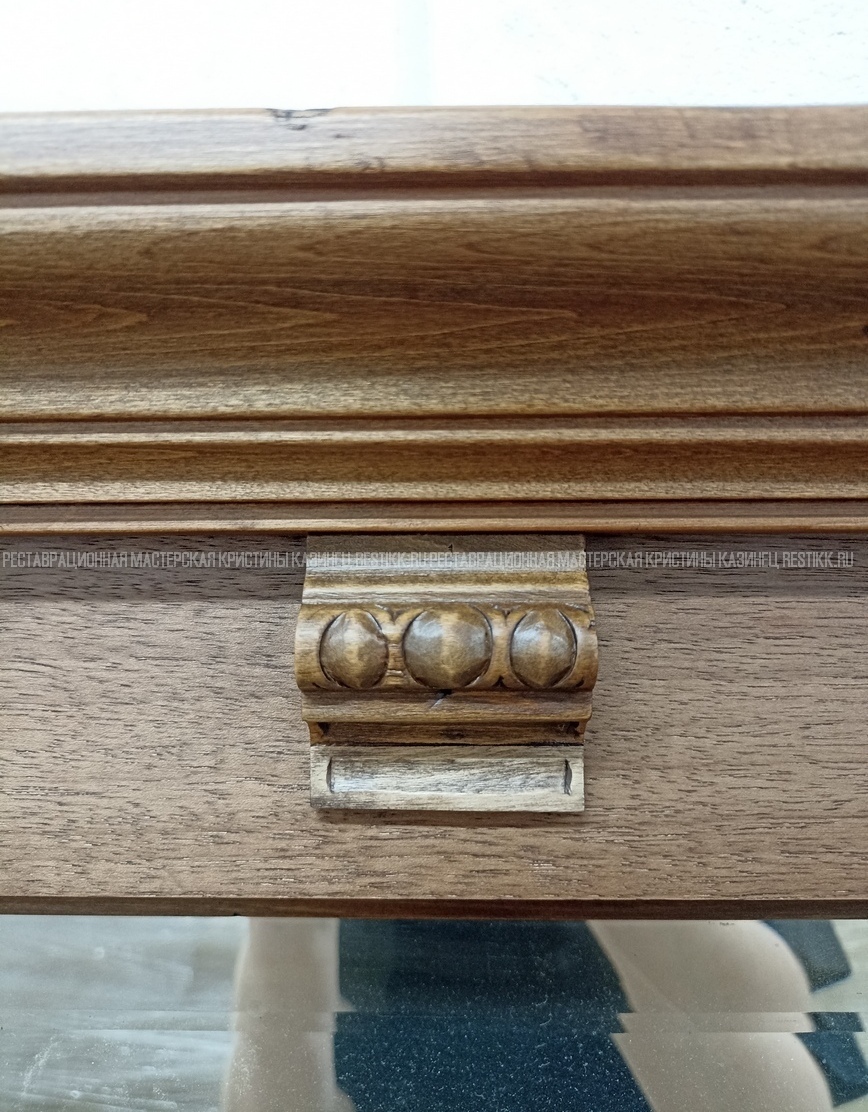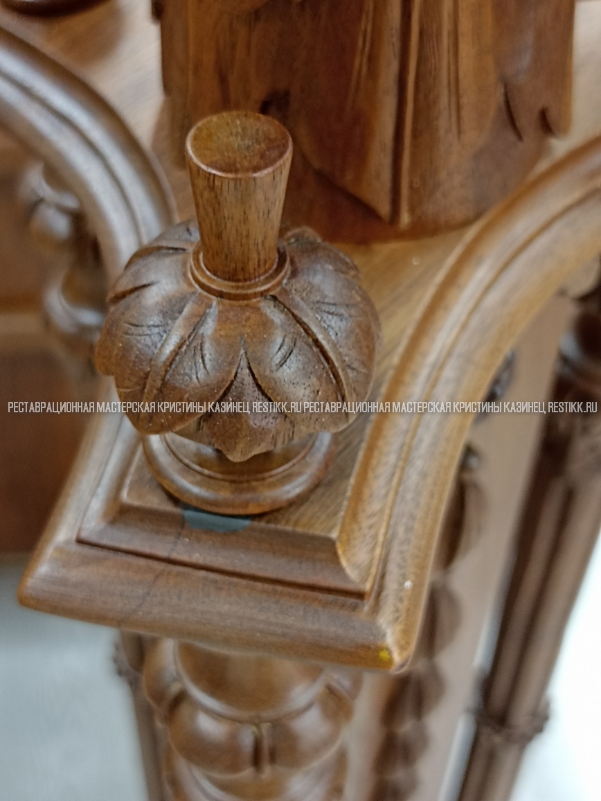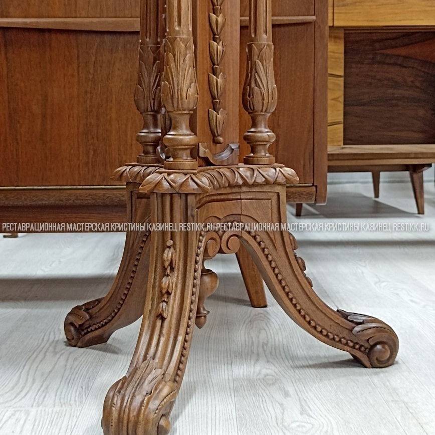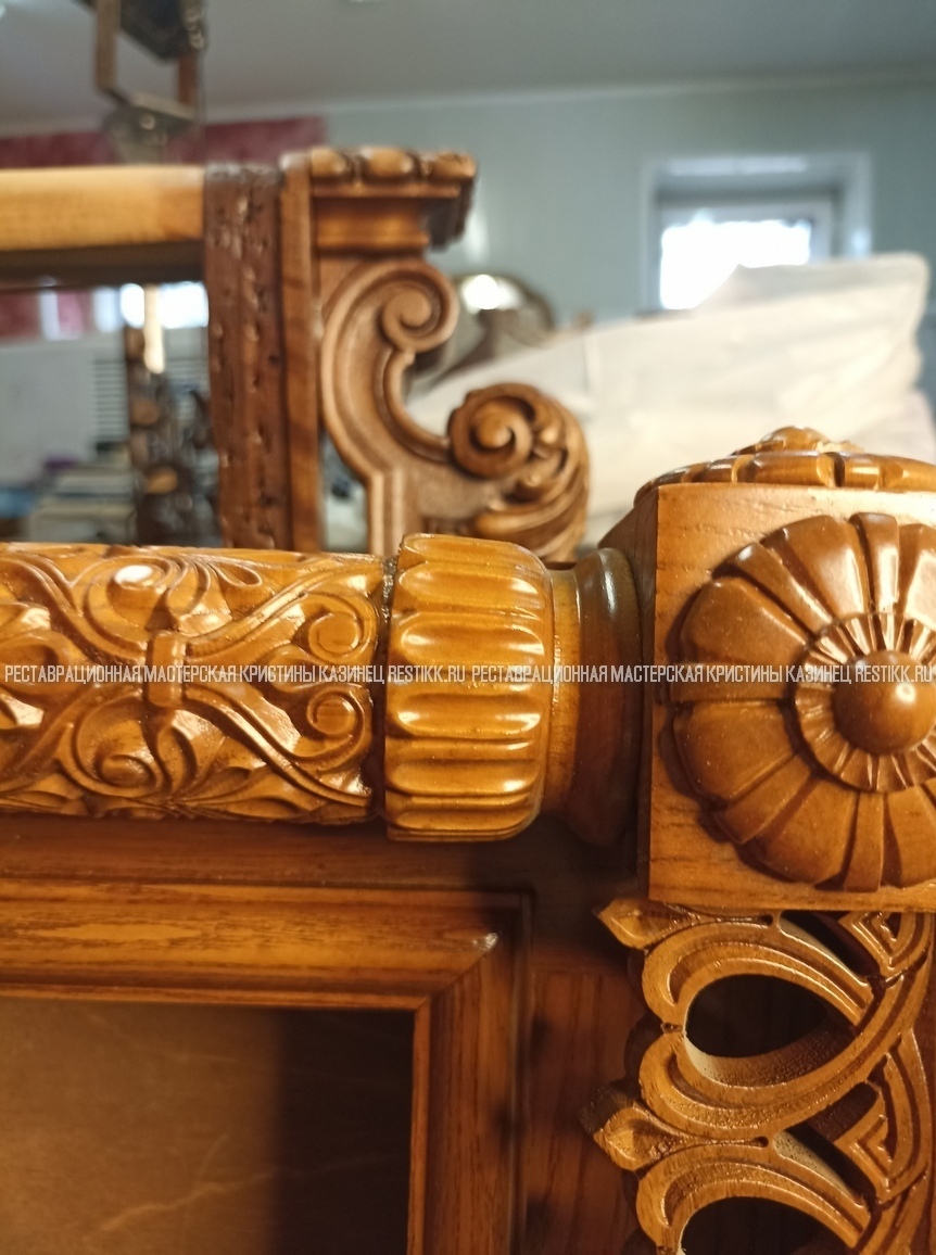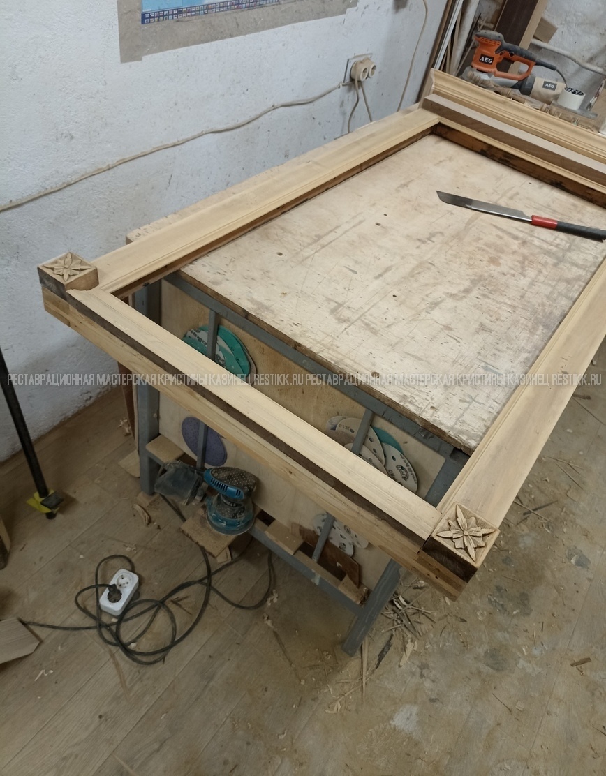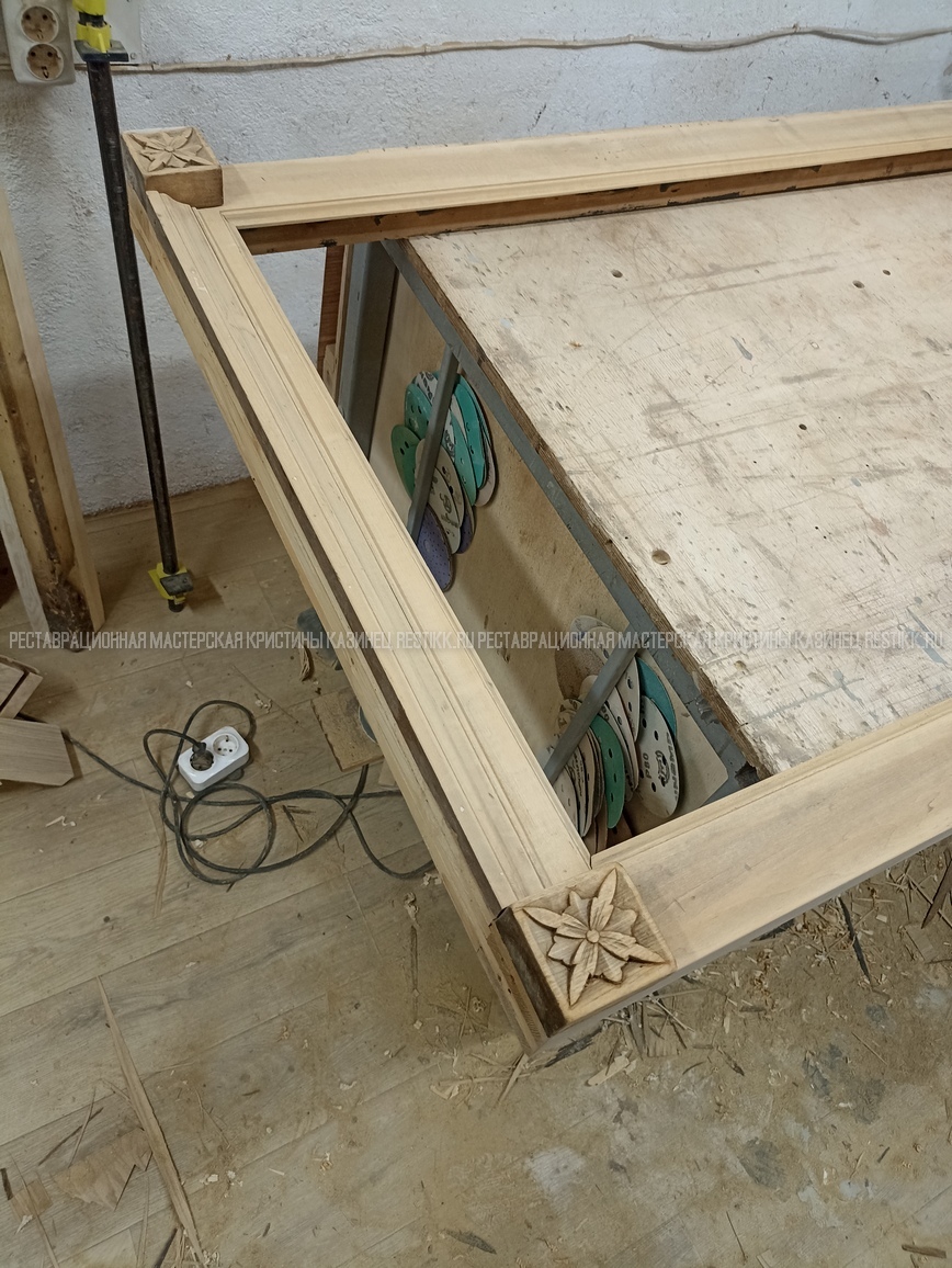 Старый шпон повсеместно отслаивался, сохранить его было невозможно. Поэтому работа предполагала полную перефанеровку всех плоскостей.