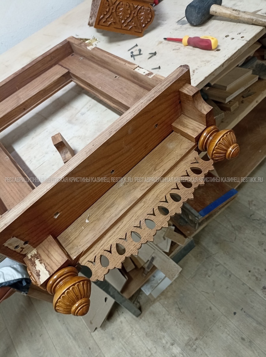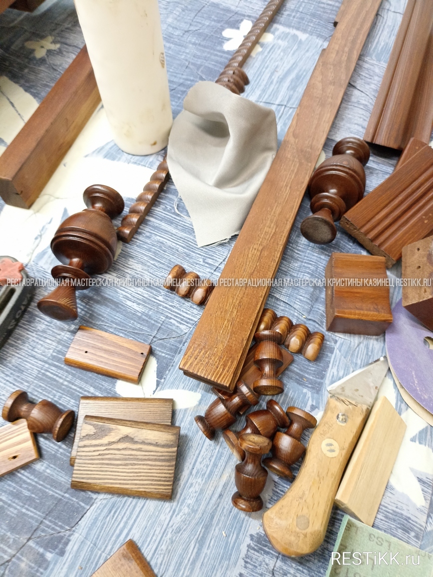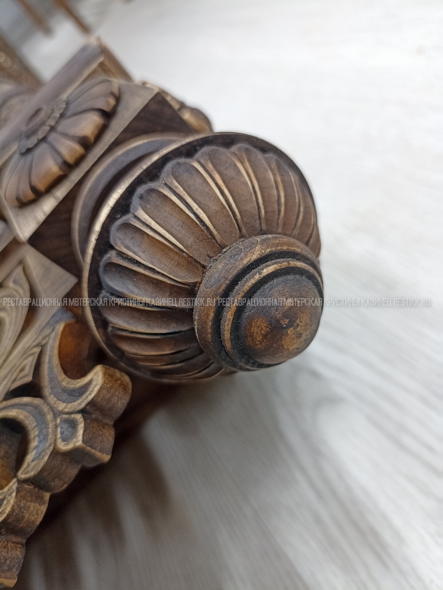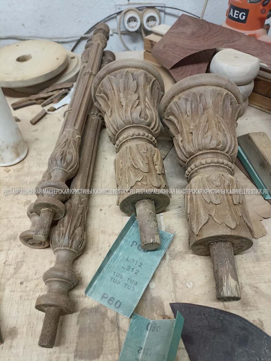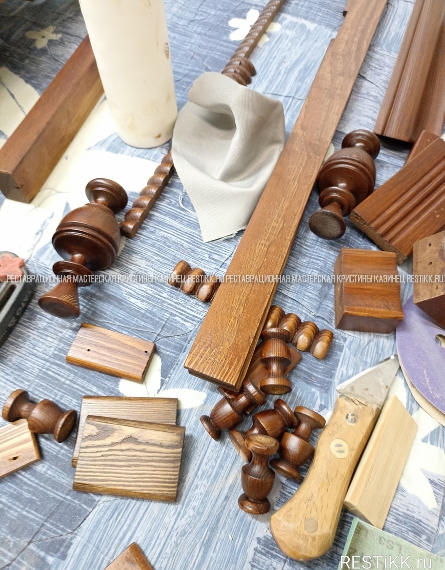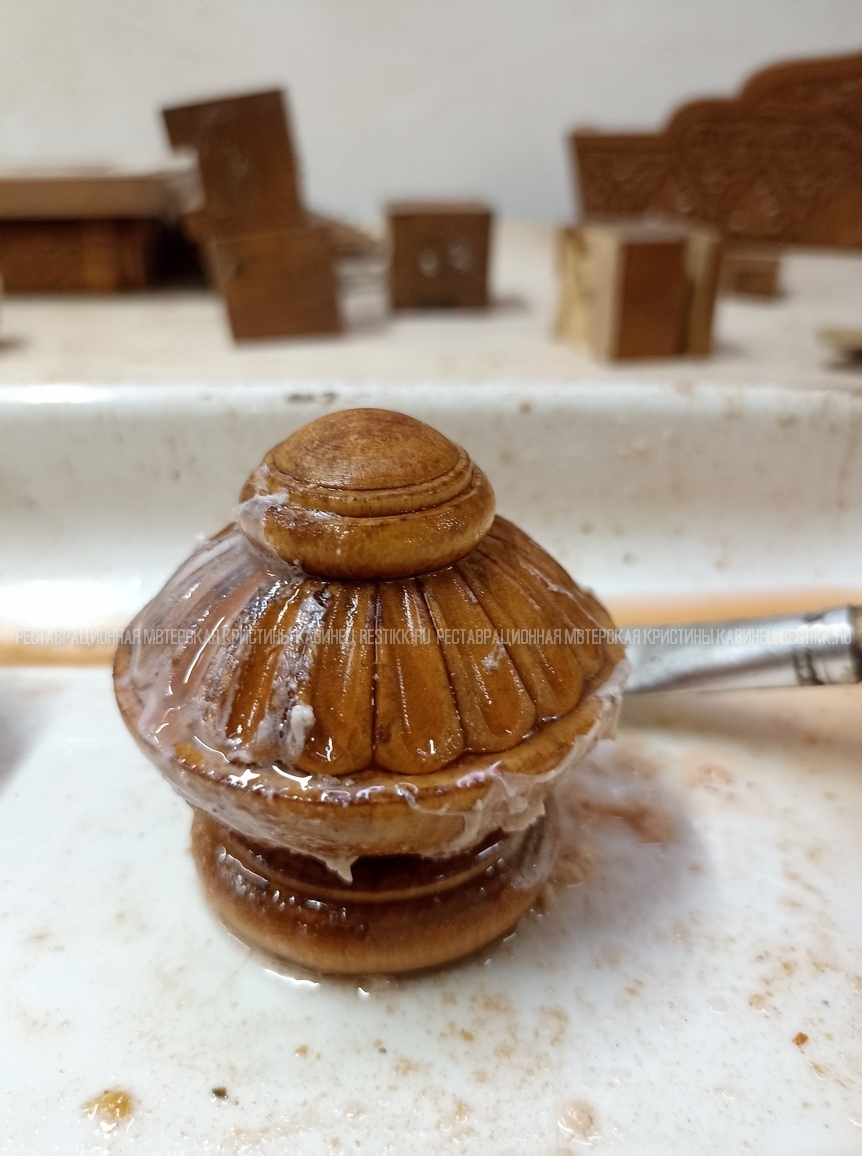 Старый шпон повсеместно отслаивался, сохранить его было невозможно. Поэтому работа предполагала полную перефанеровку всех плоскостей.