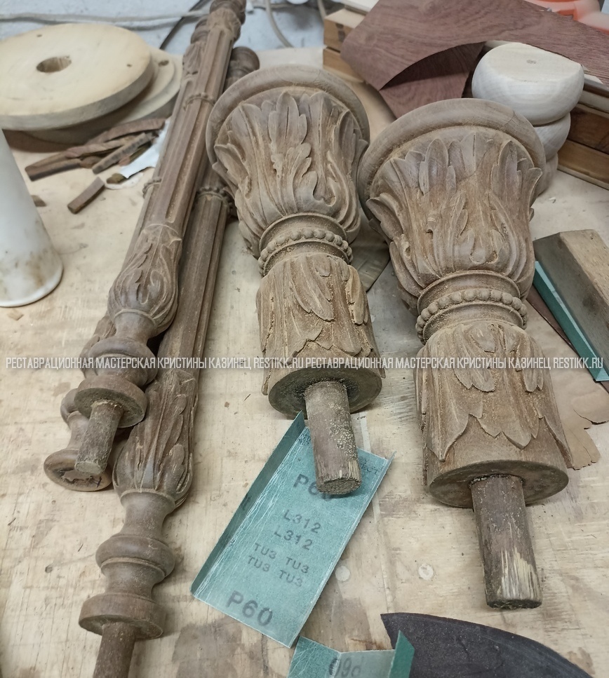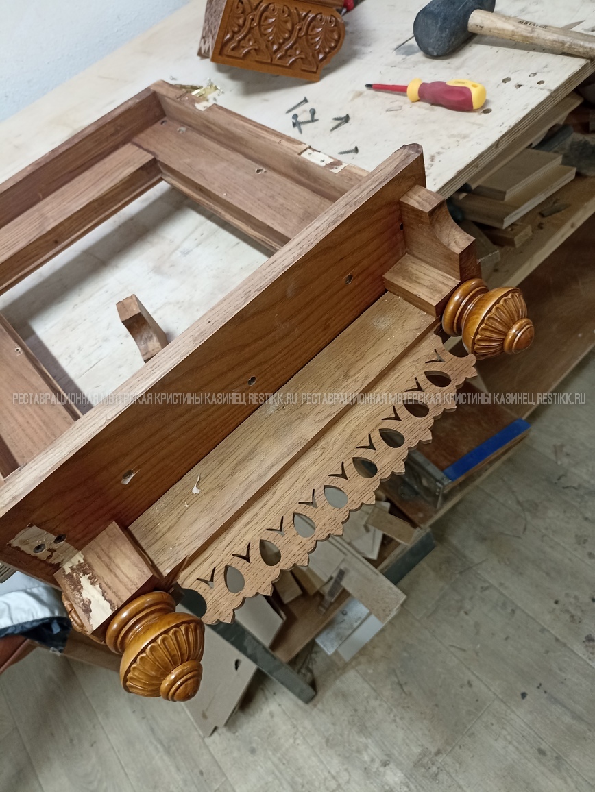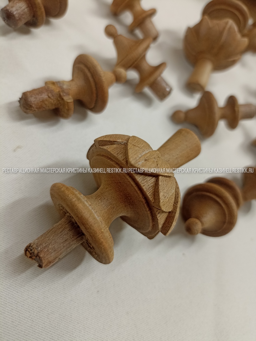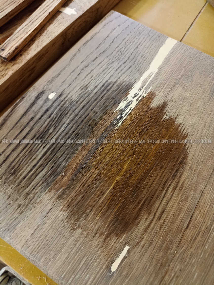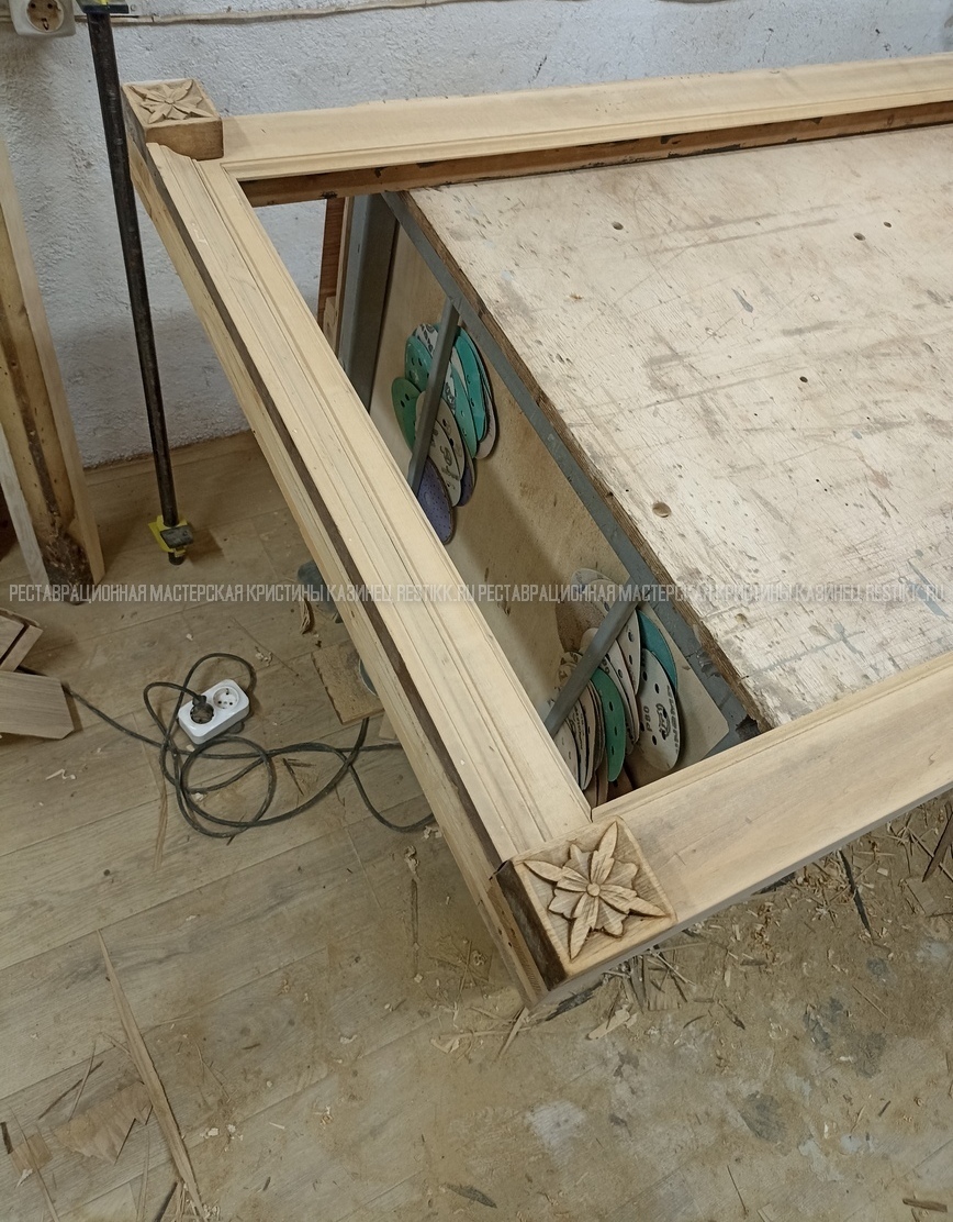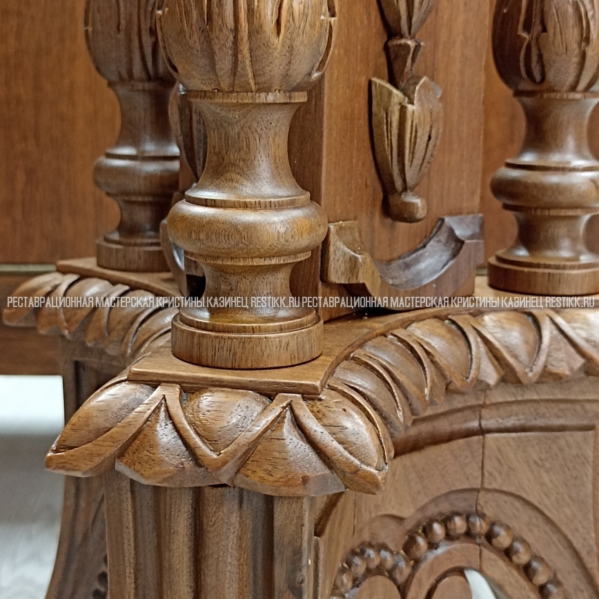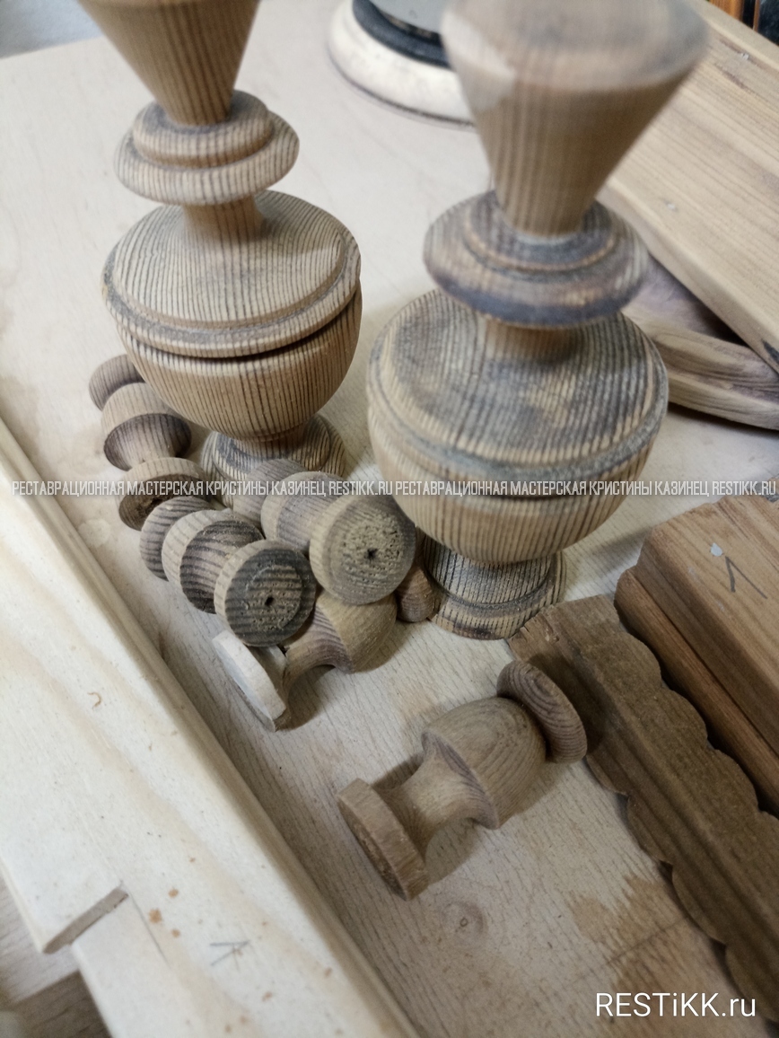 Старый шпон повсеместно отслаивался, сохранить его было невозможно. Поэтому работа предполагала полную перефанеровку всех плоскостей.