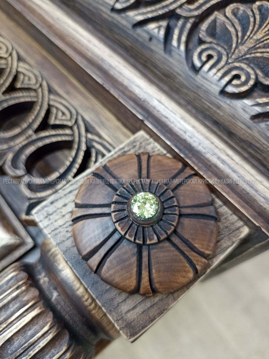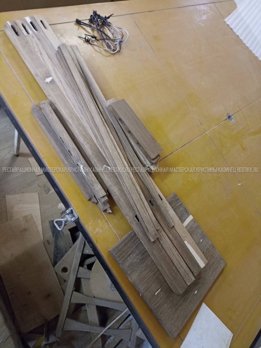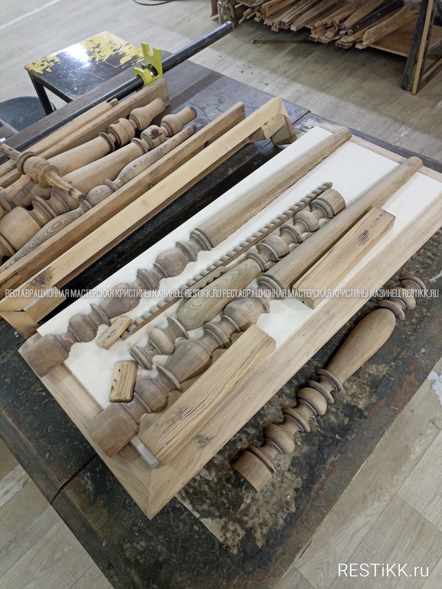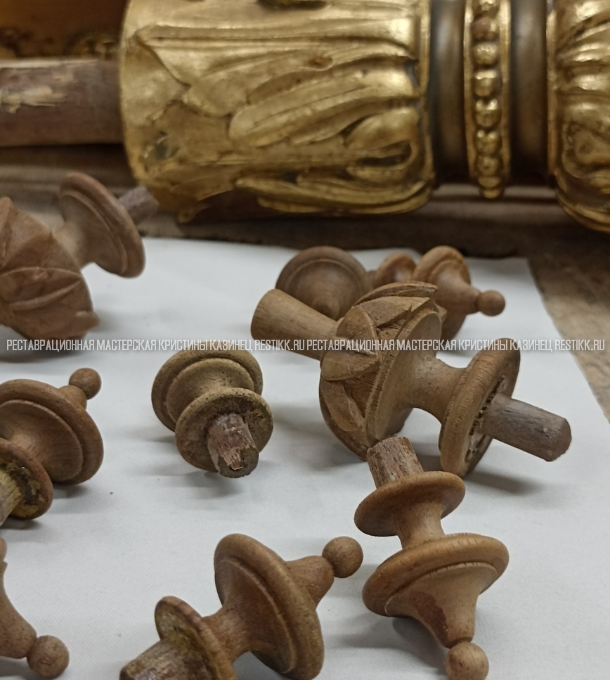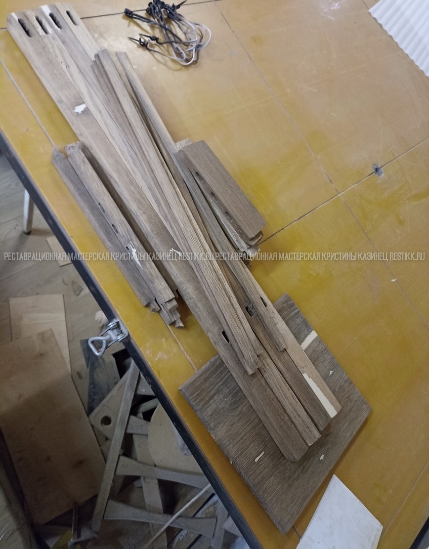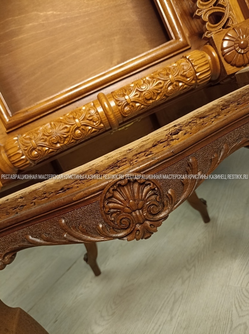 Старый шпон повсеместно отслаивался, сохранить его было невозможно. Поэтому работа предполагала полную перефанеровку всех плоскостей.