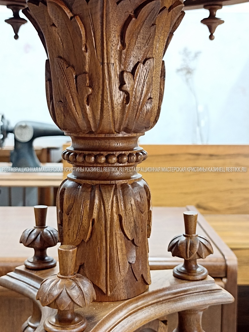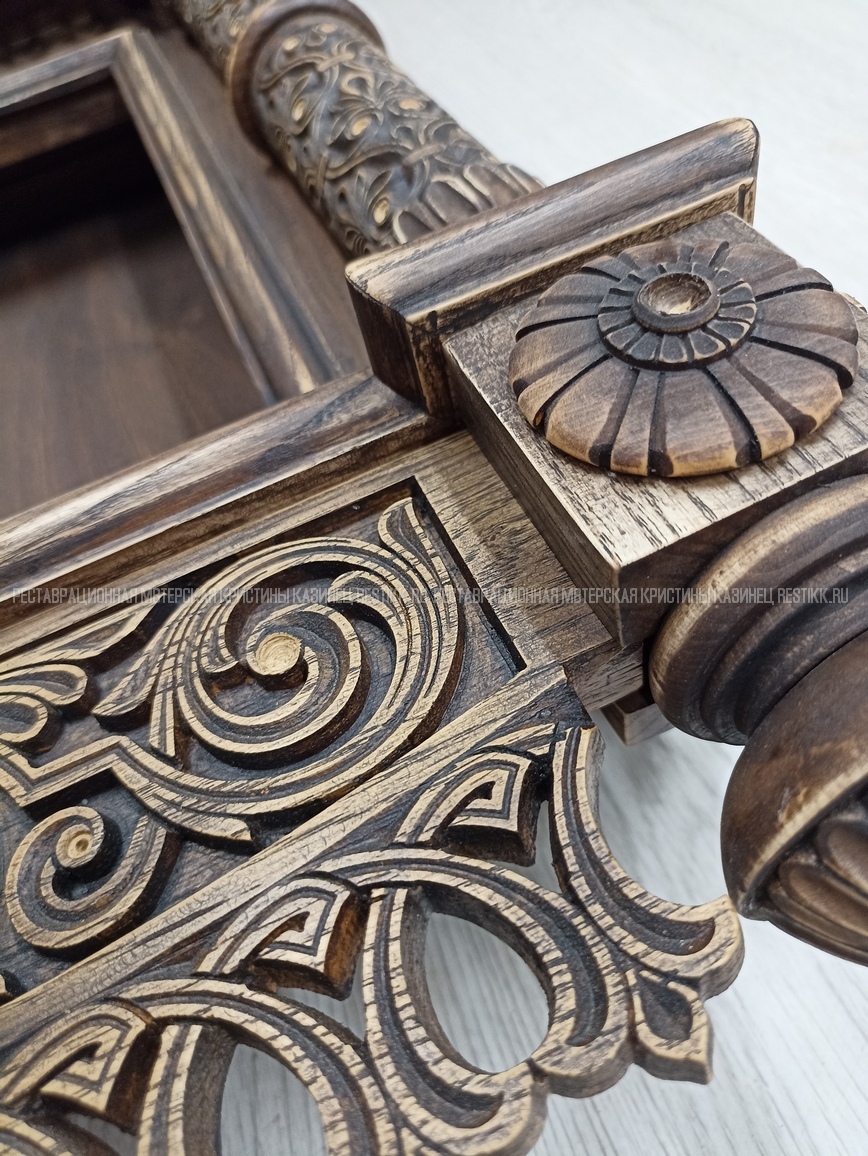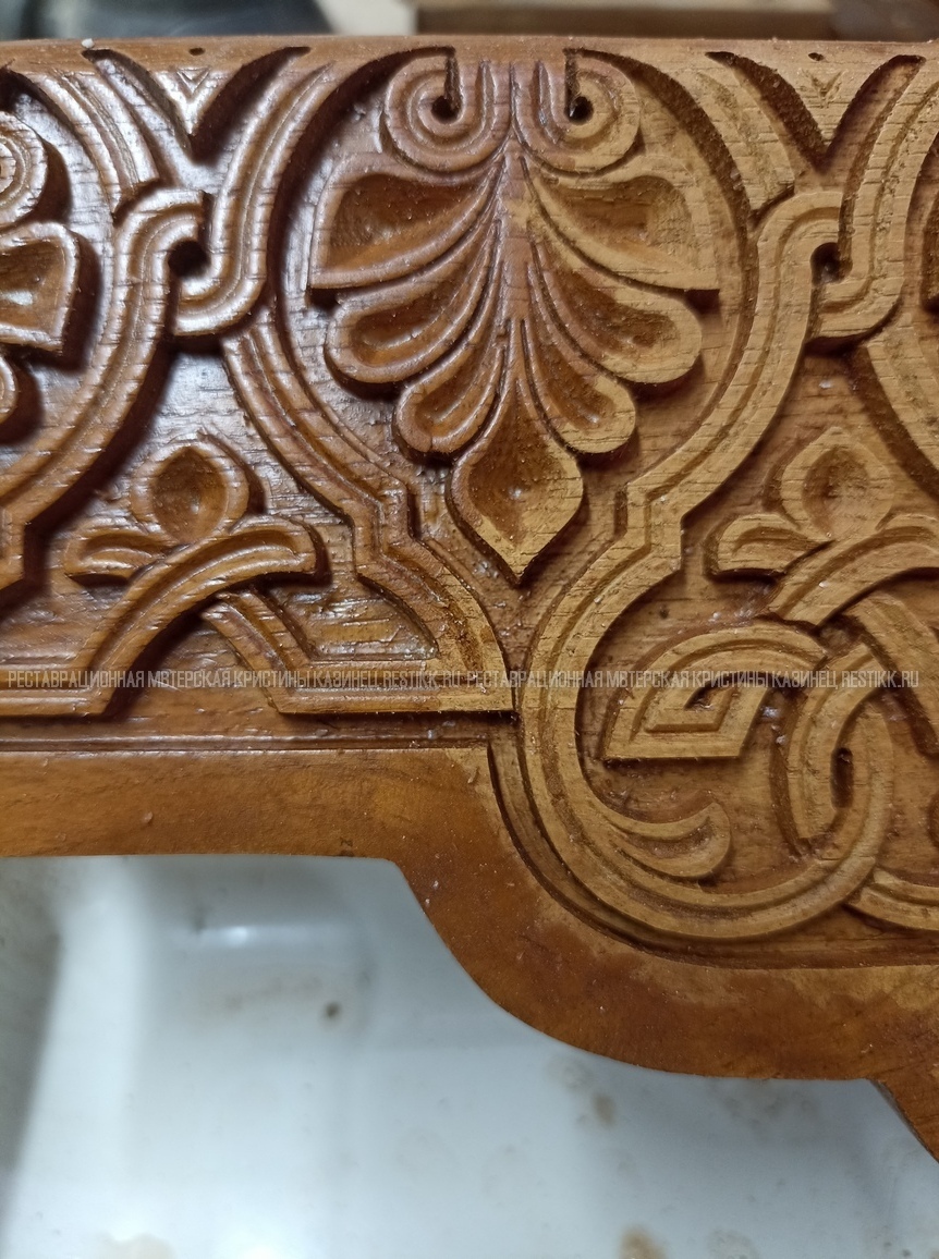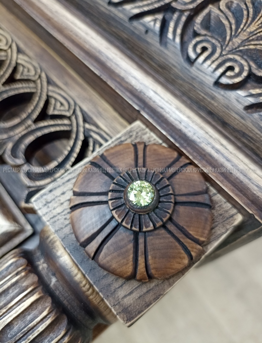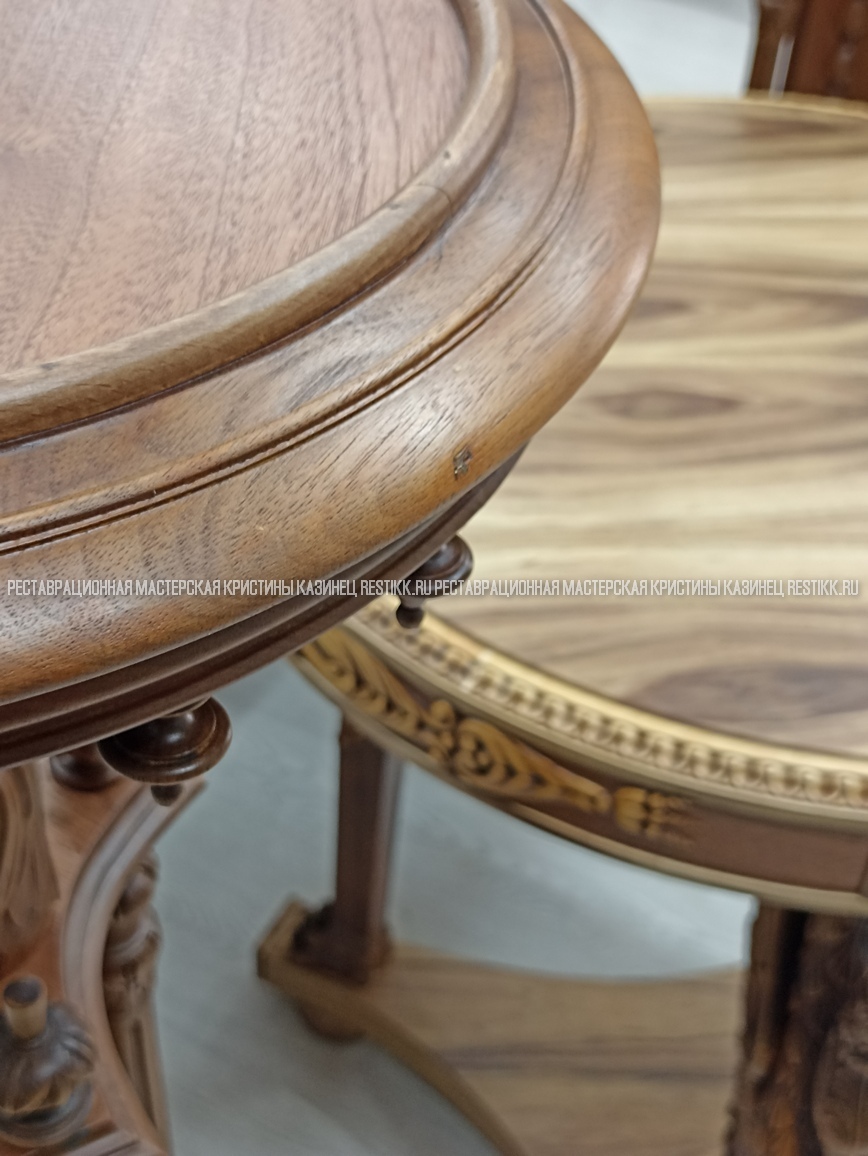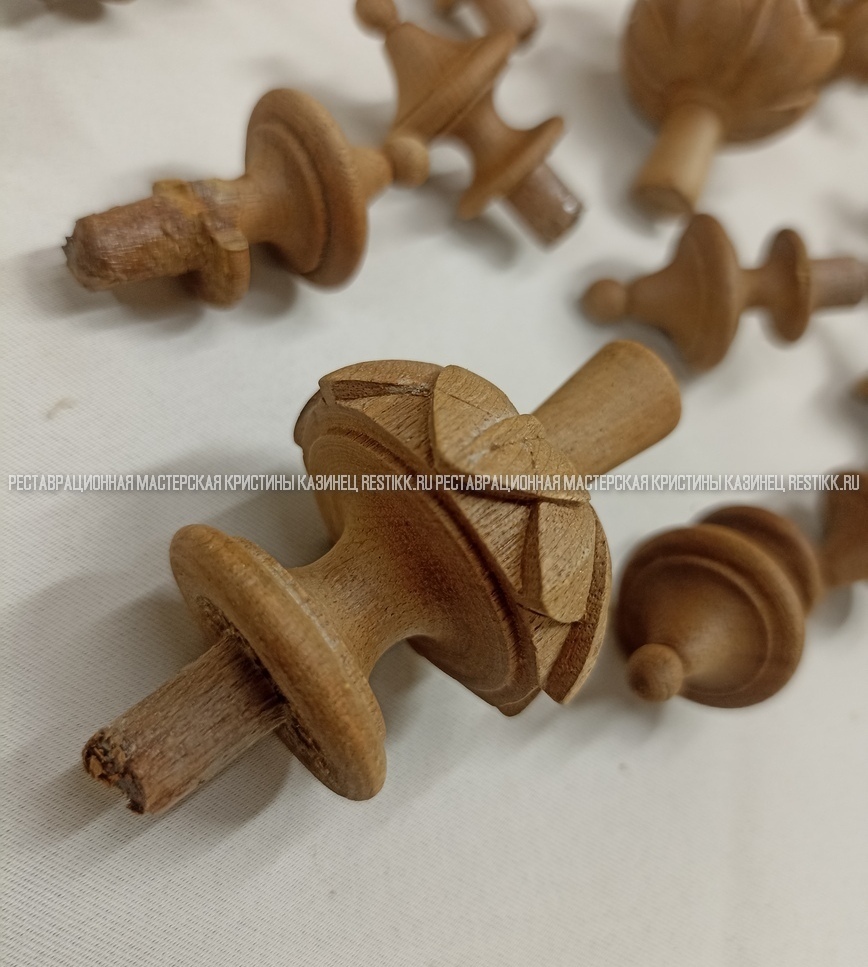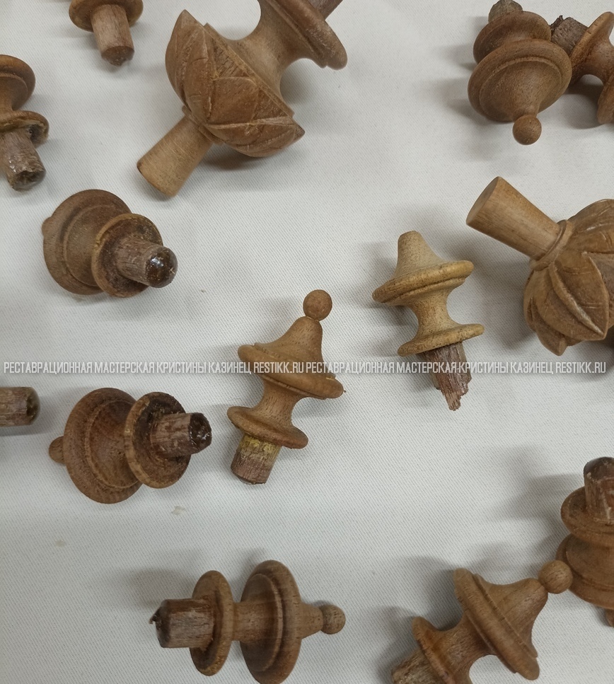 Старый шпон повсеместно отслаивался, сохранить его было невозможно. Поэтому работа предполагала полную перефанеровку всех плоскостей.