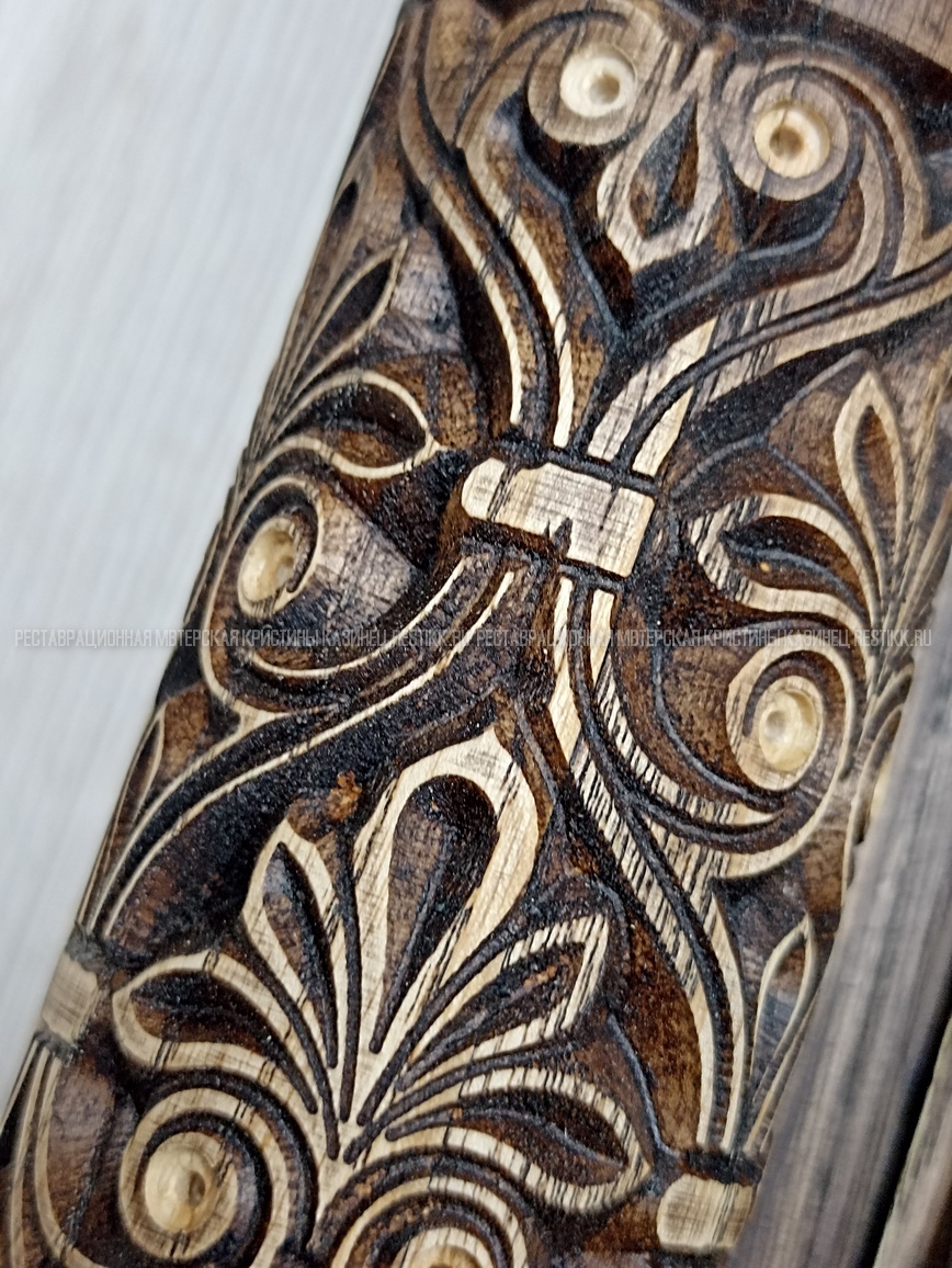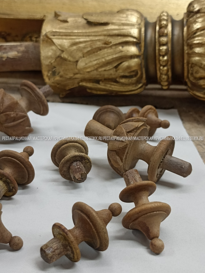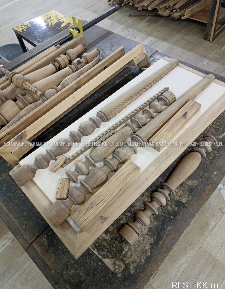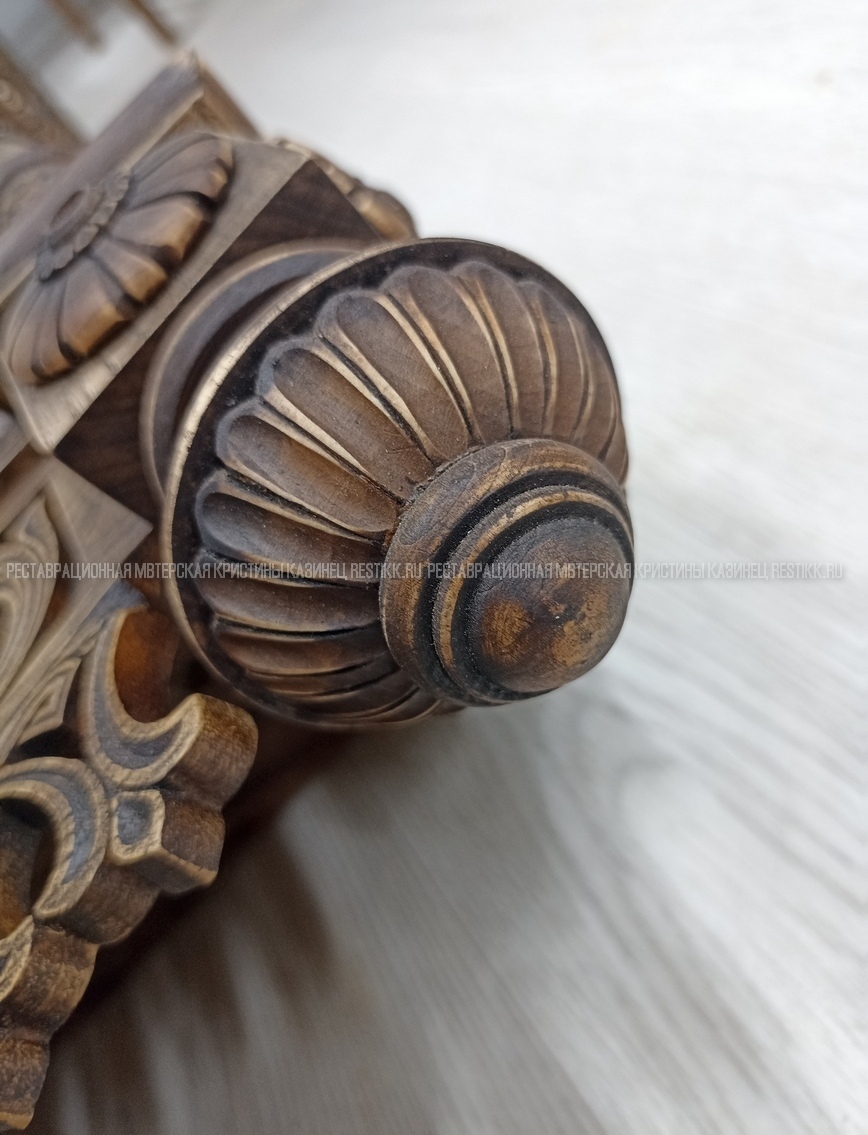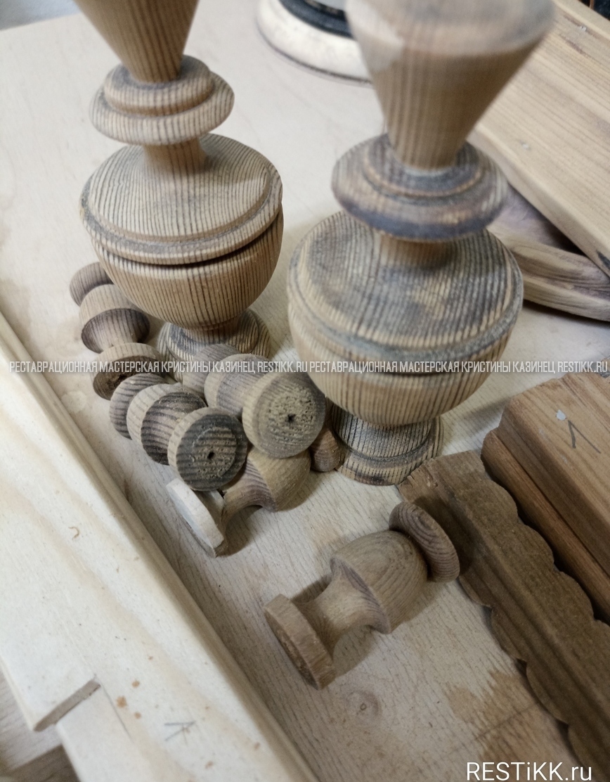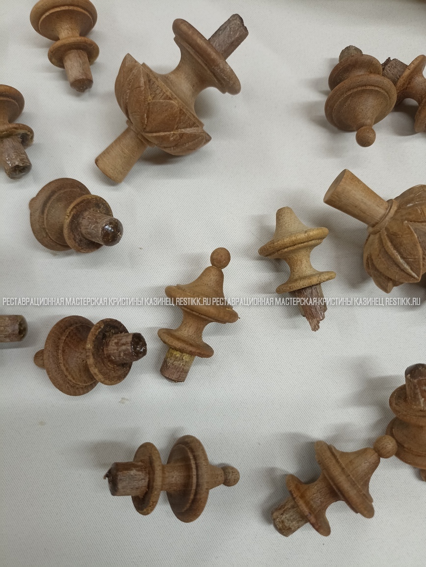 Старый шпон повсеместно отслаивался, сохранить его было невозможно. Поэтому работа предполагала полную перефанеровку всех плоскостей.