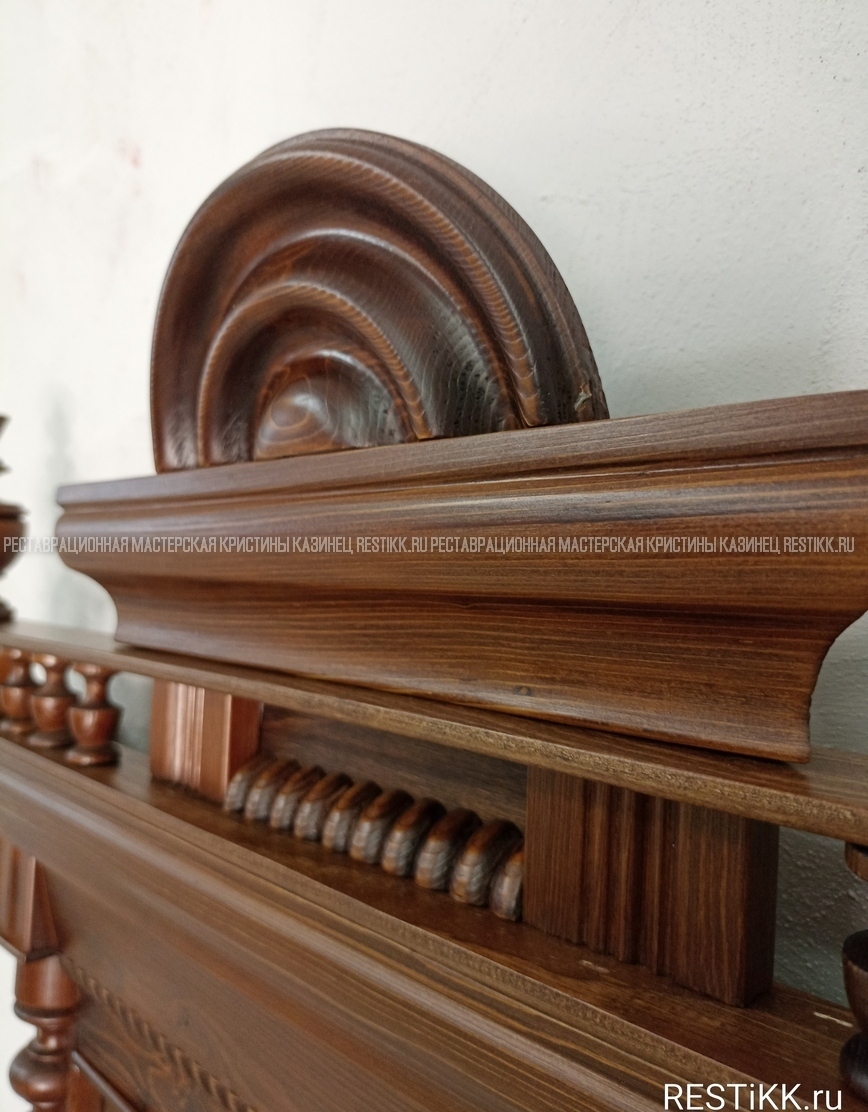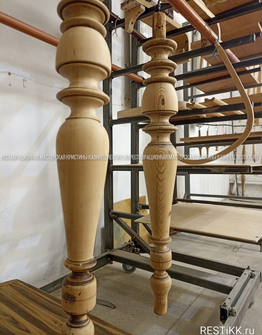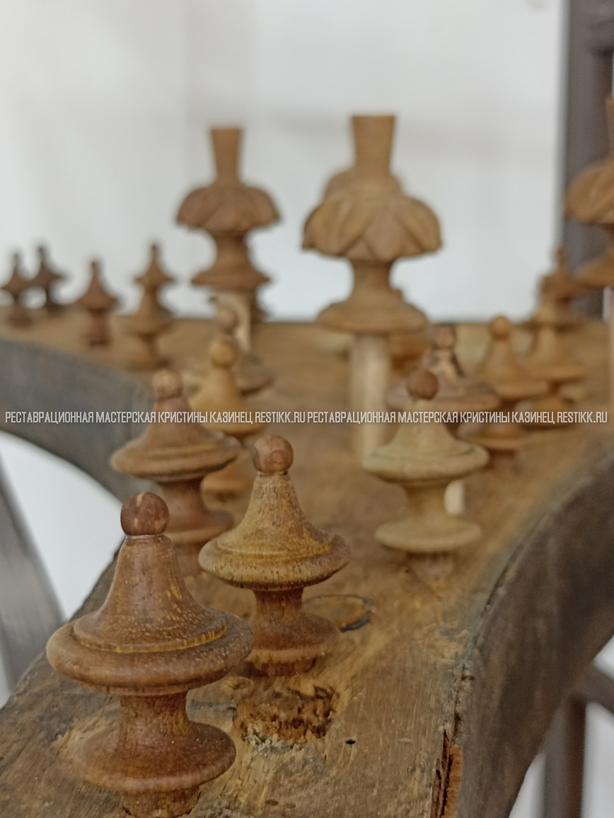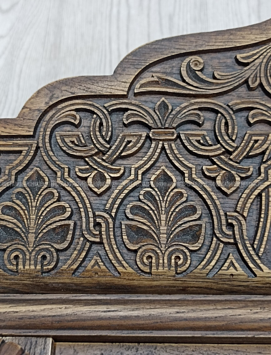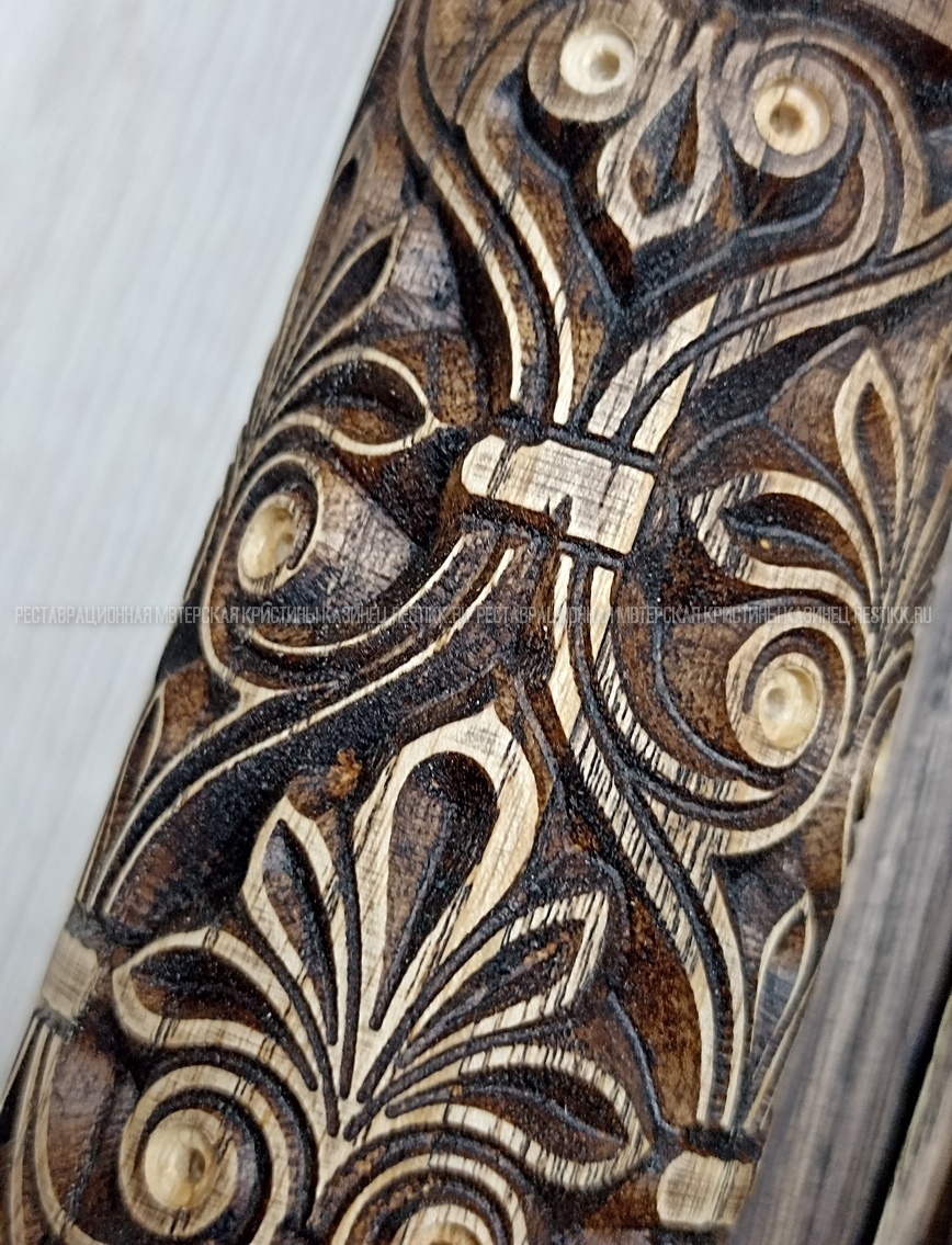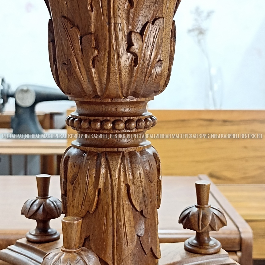 Старый шпон повсеместно отслаивался, сохранить его было невозможно. Поэтому работа предполагала полную перефанеровку всех плоскостей.
