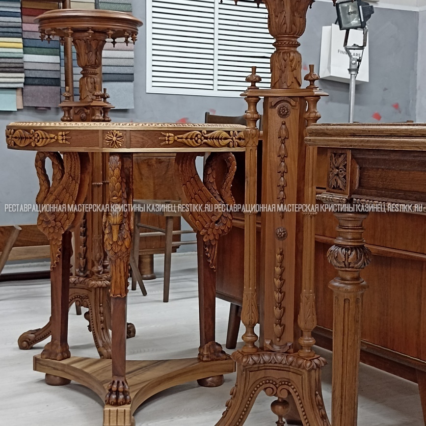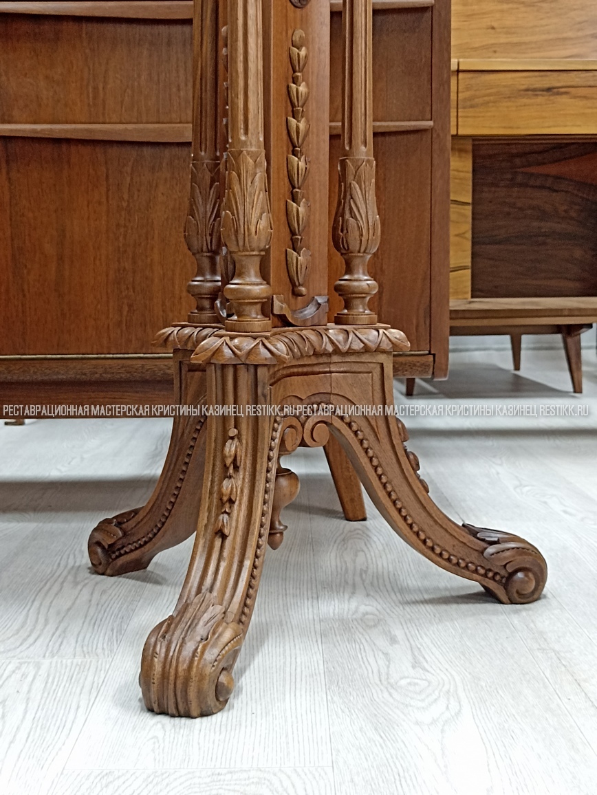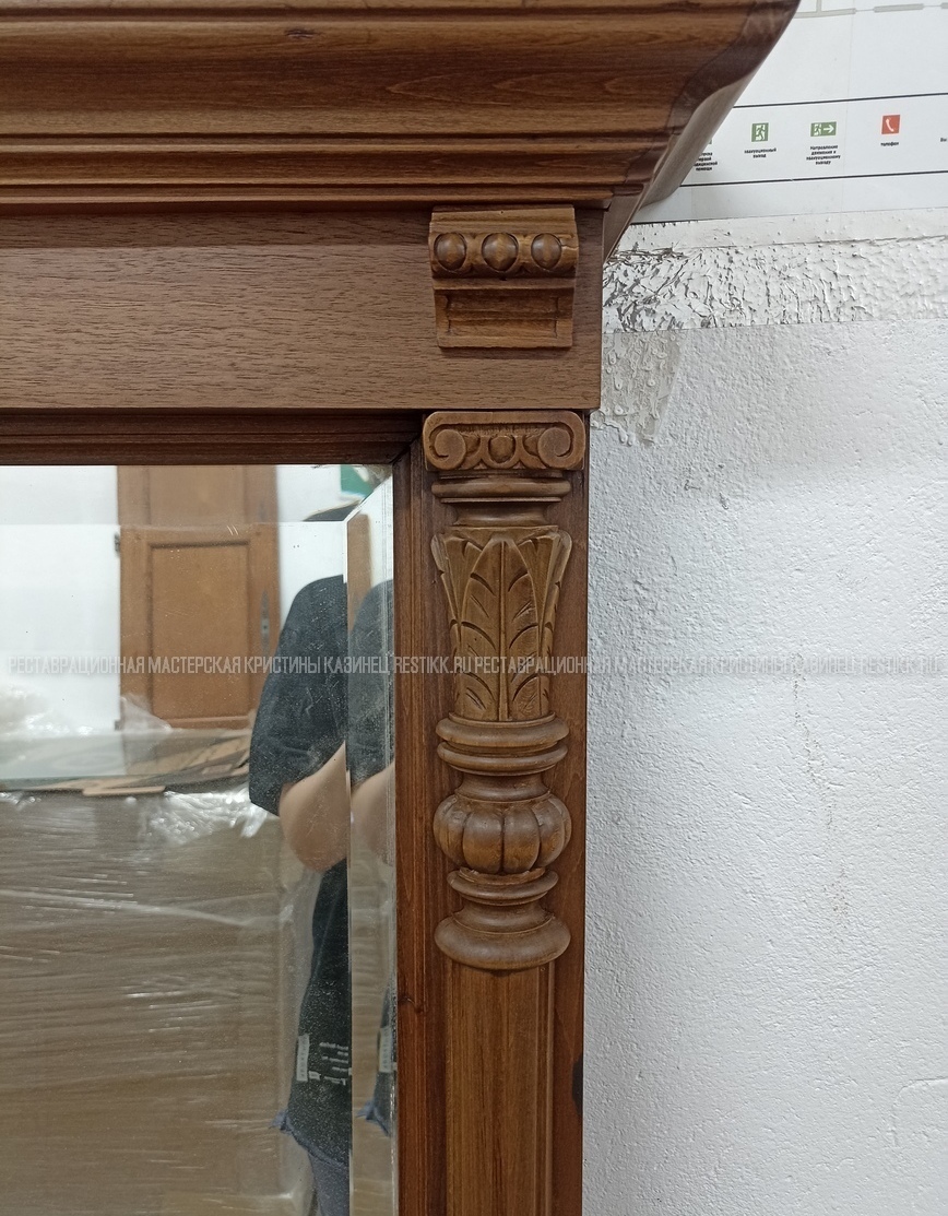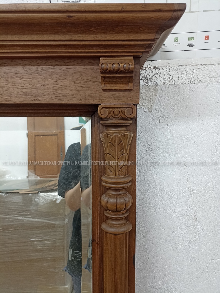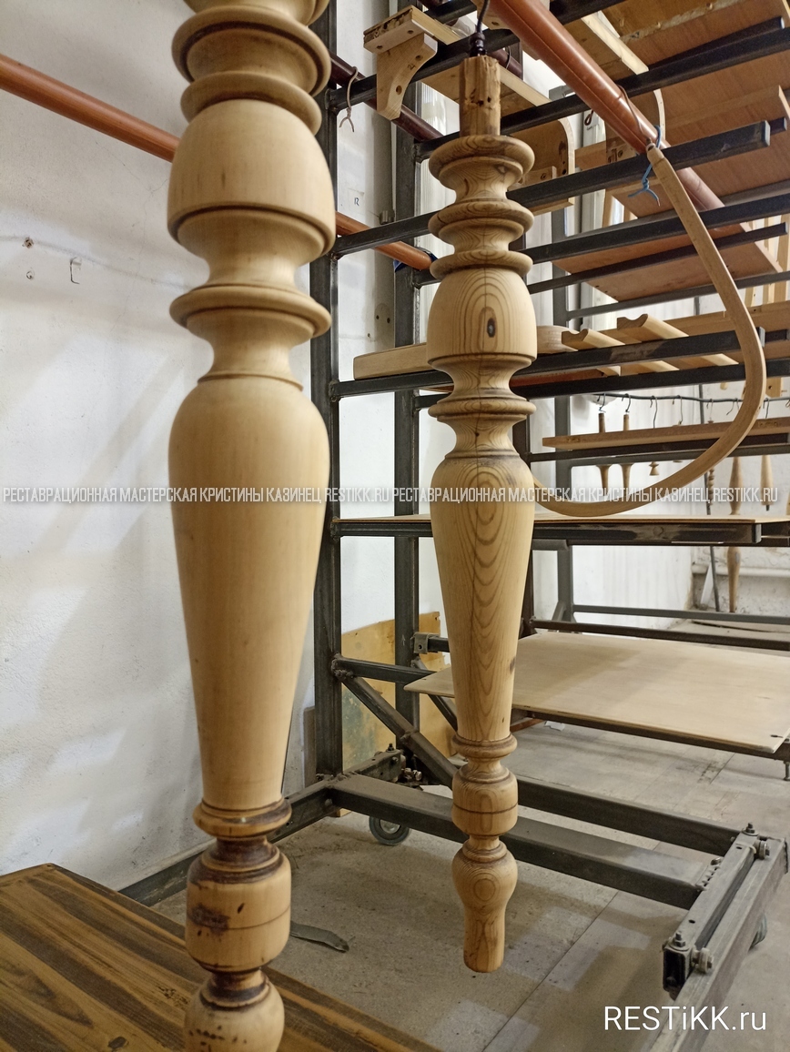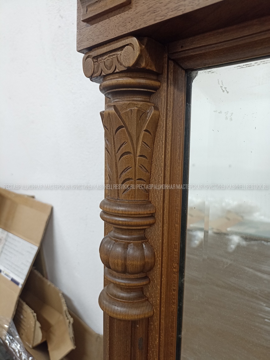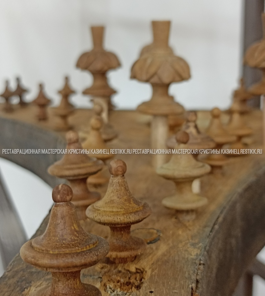 Старый шпон повсеместно отслаивался, сохранить его было невозможно. Поэтому работа предполагала полную перефанеровку всех плоскостей.
