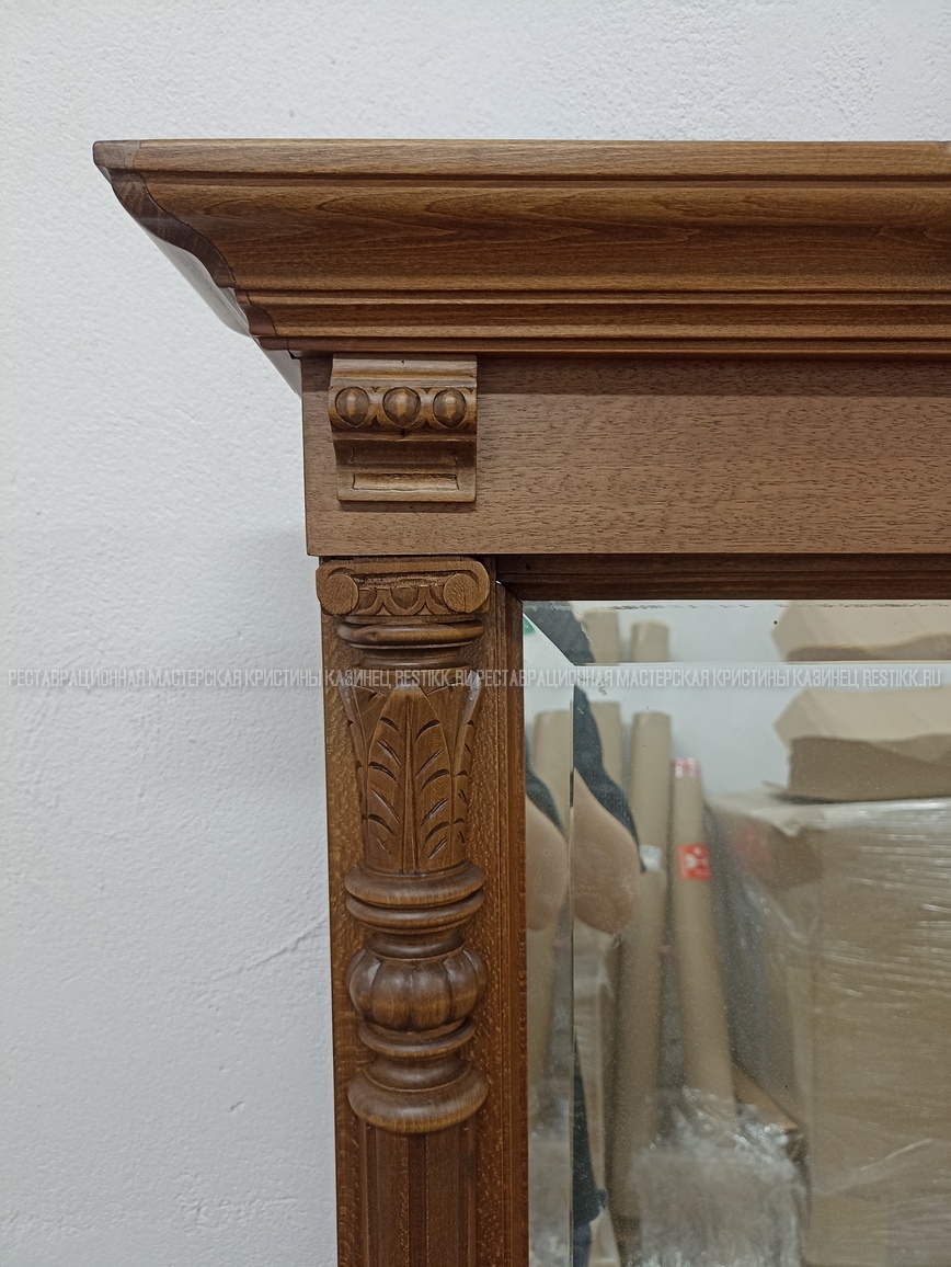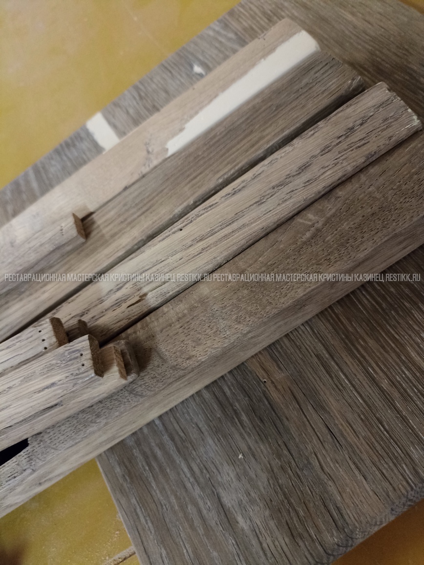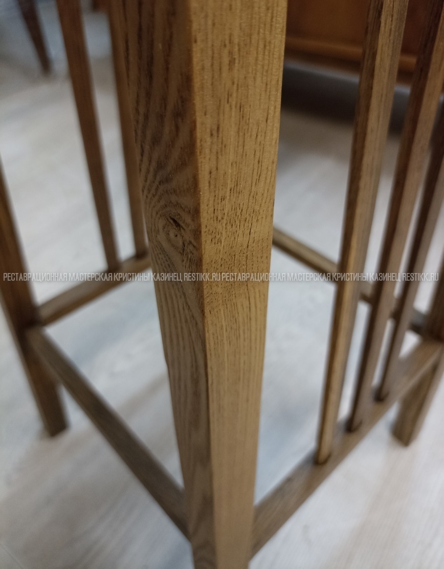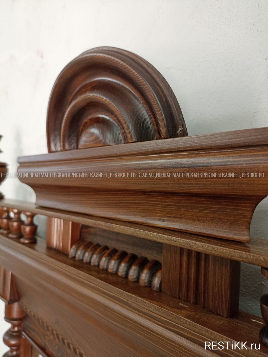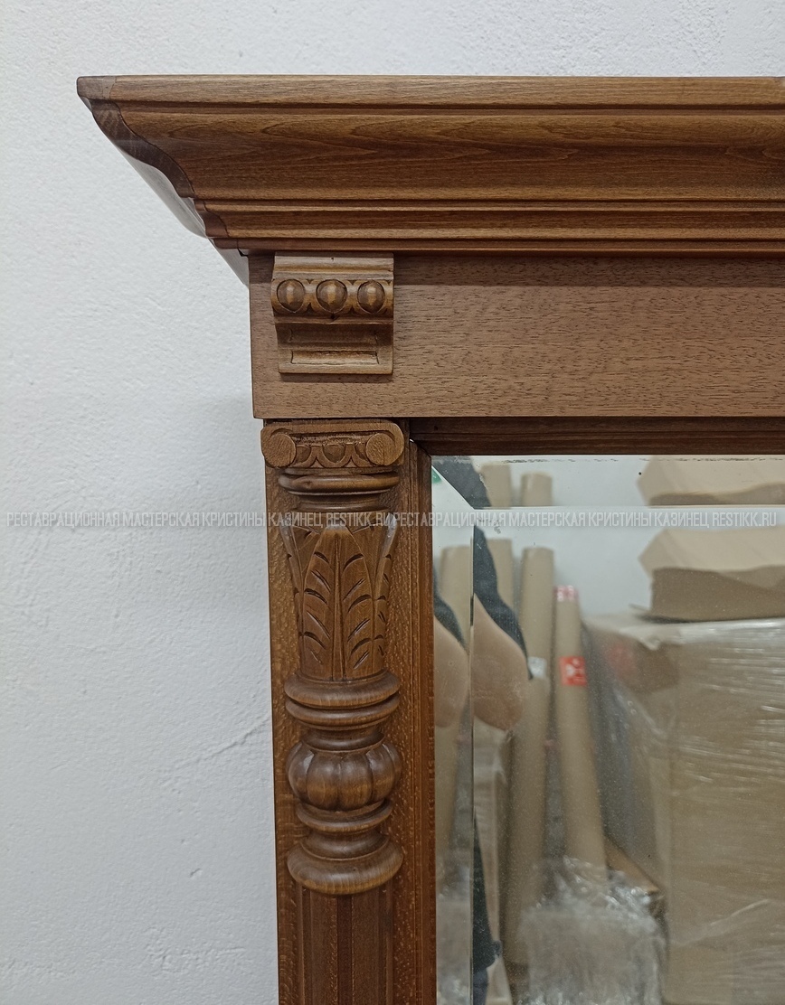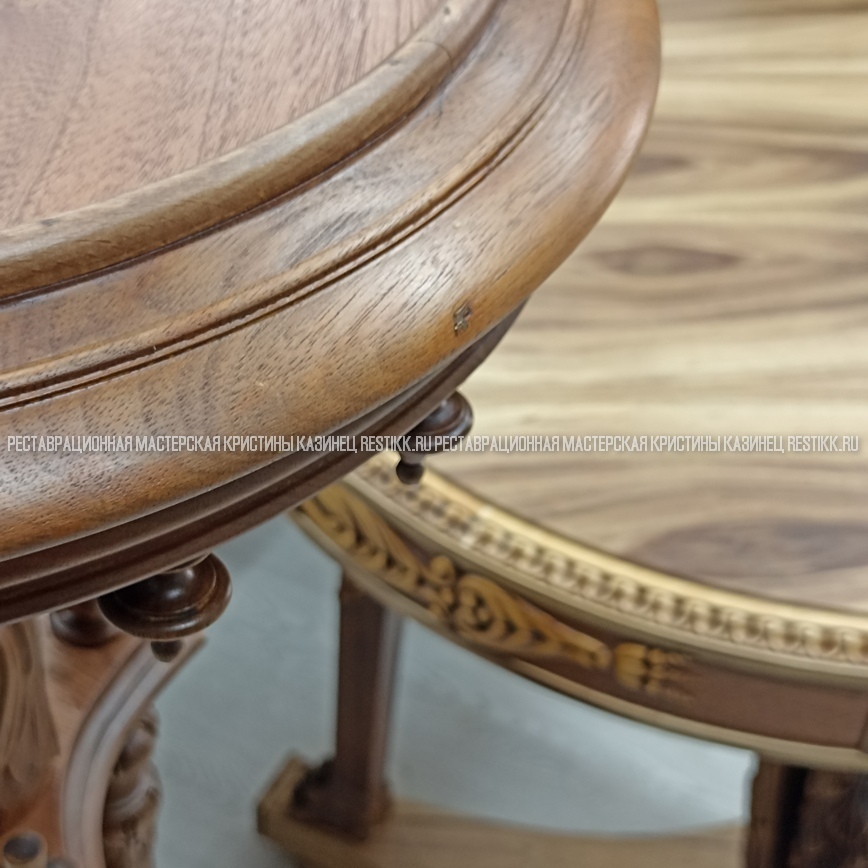 Старый шпон повсеместно отслаивался, сохранить его было невозможно. Поэтому работа предполагала полную перефанеровку всех плоскостей.