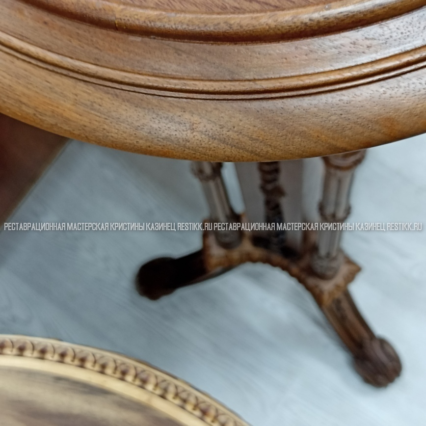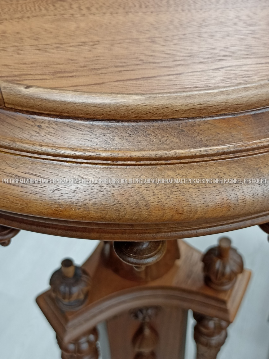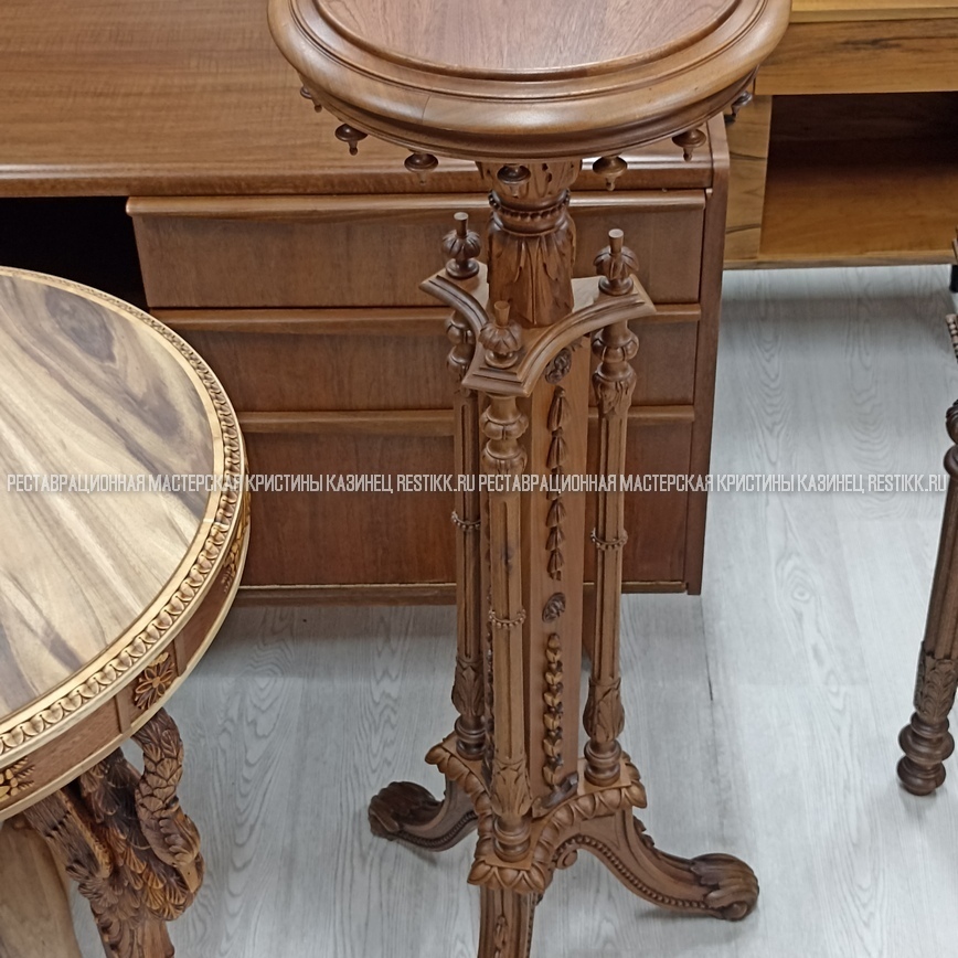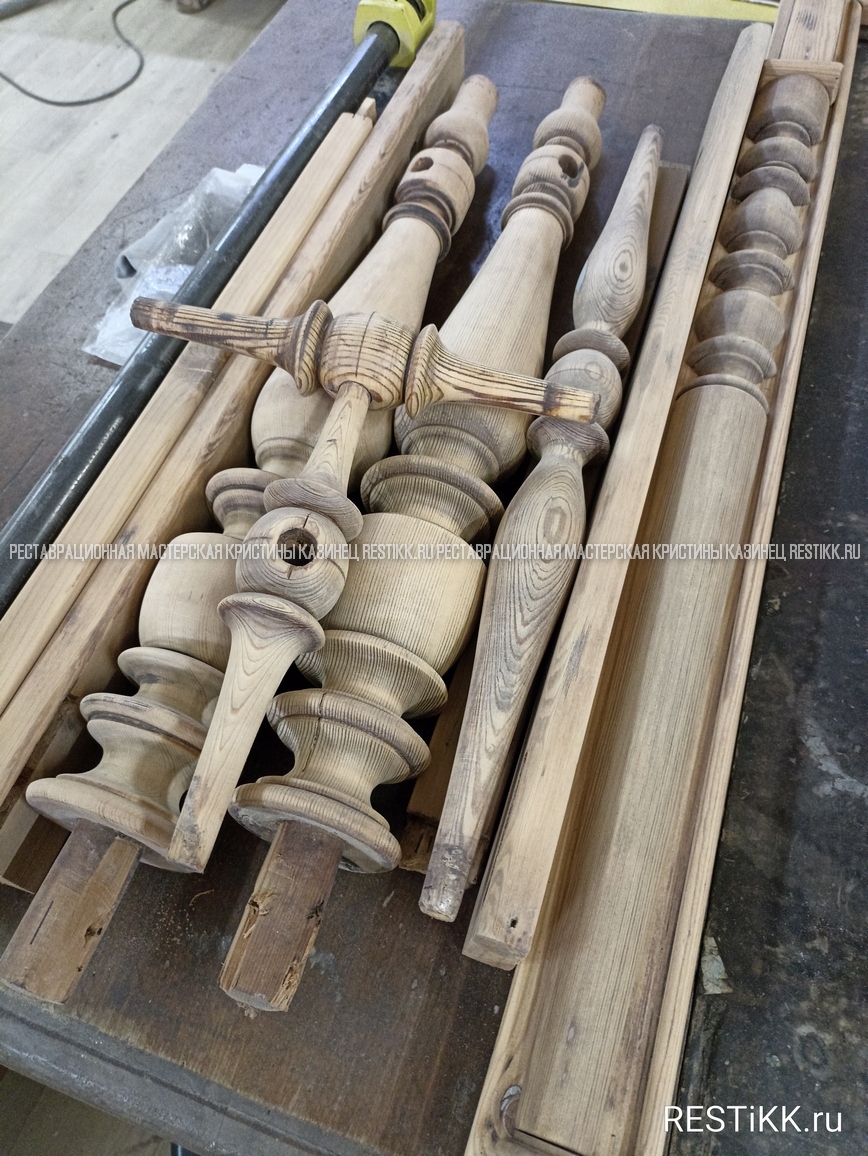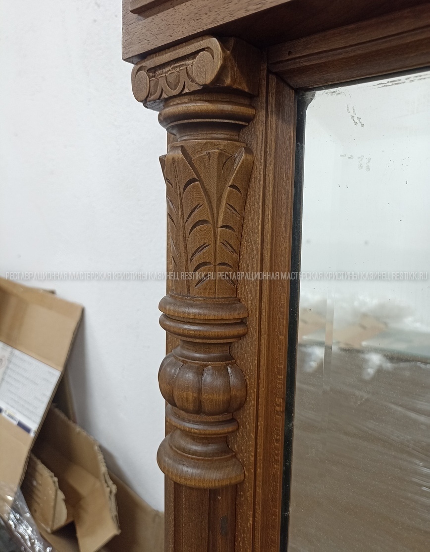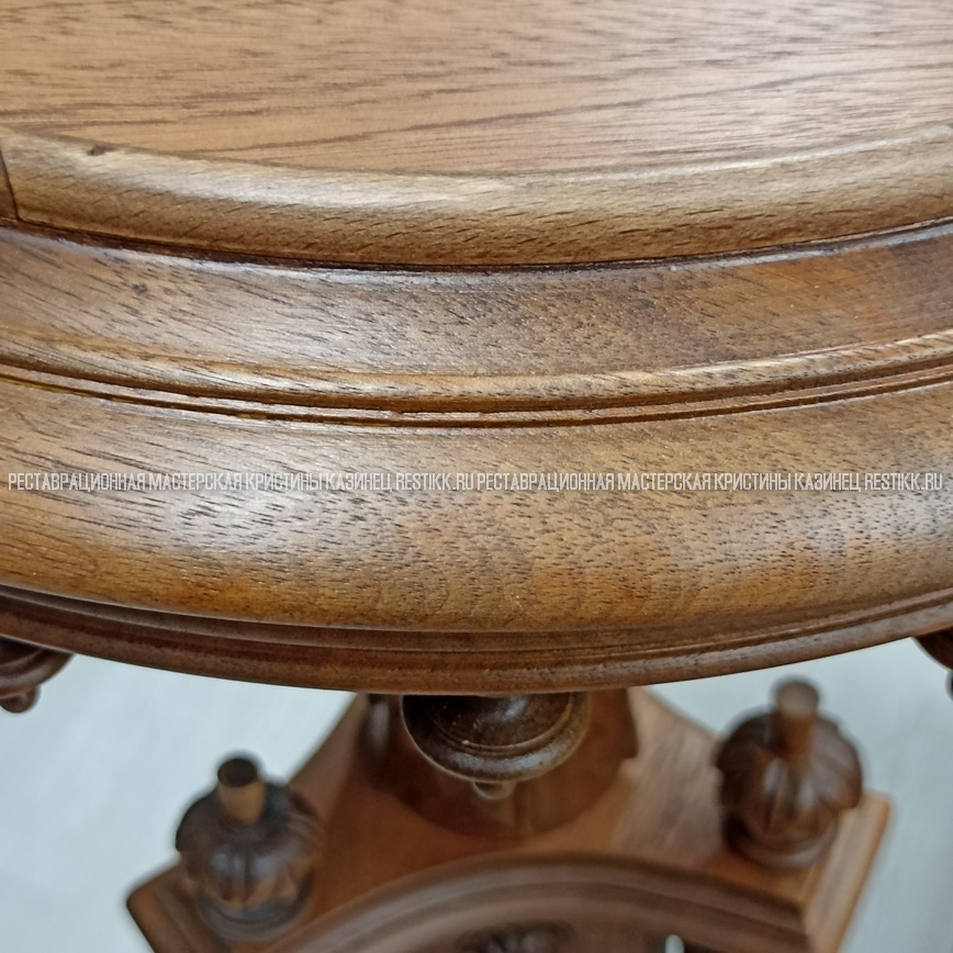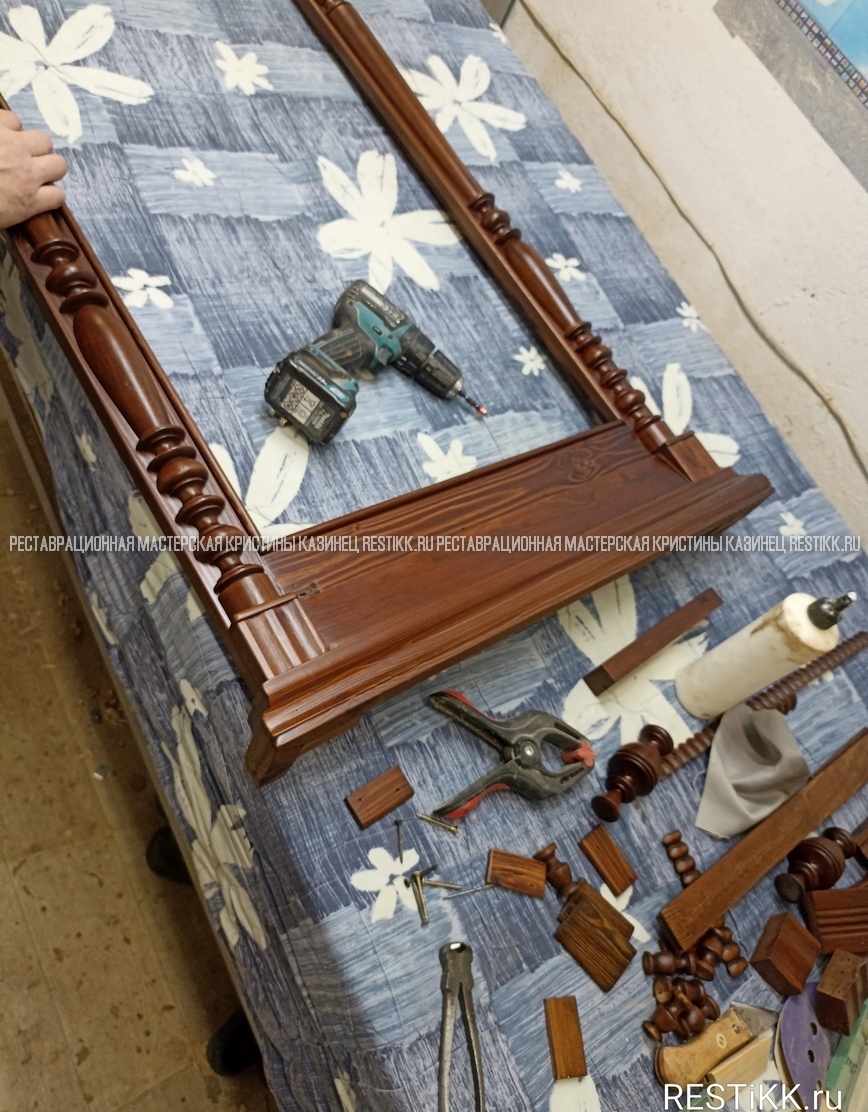 Старый шпон повсеместно отслаивался, сохранить его было невозможно. Поэтому работа предполагала полную перефанеровку всех плоскостей.