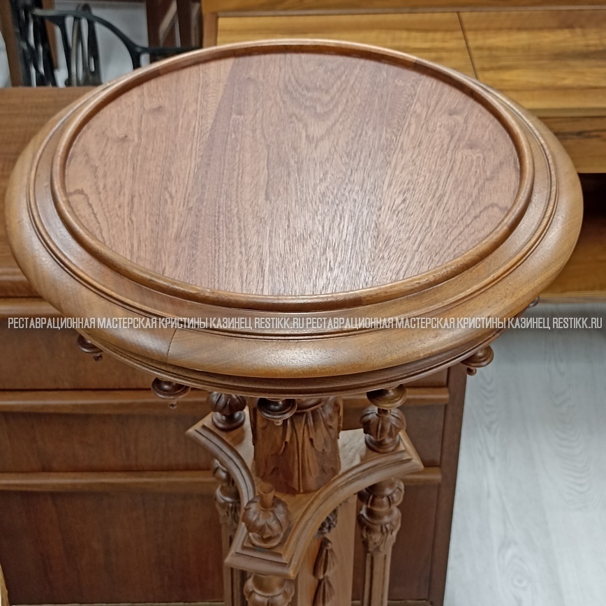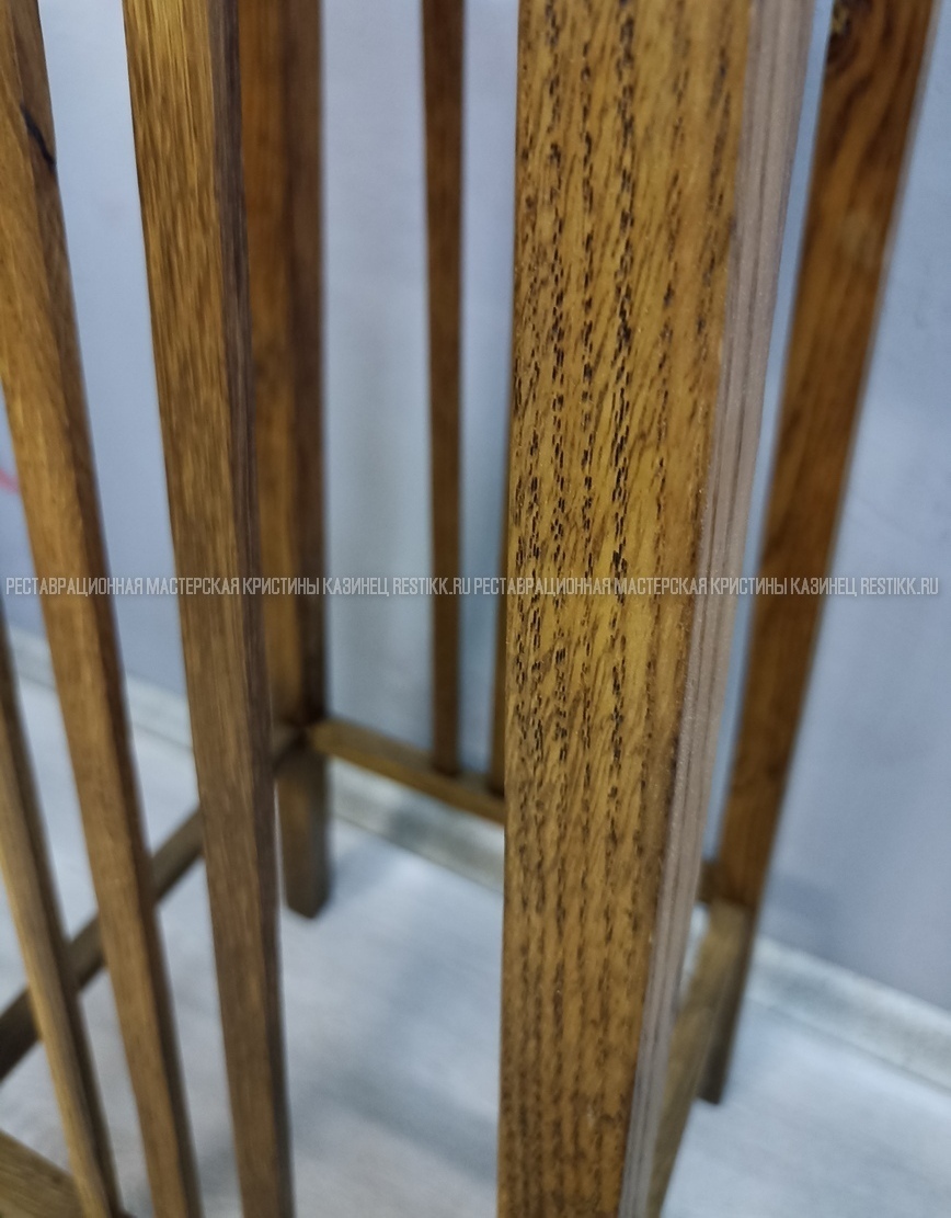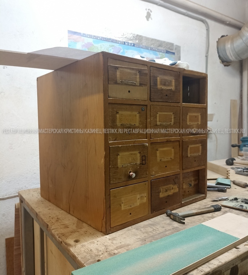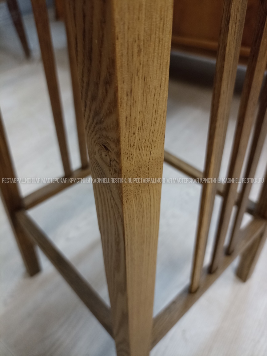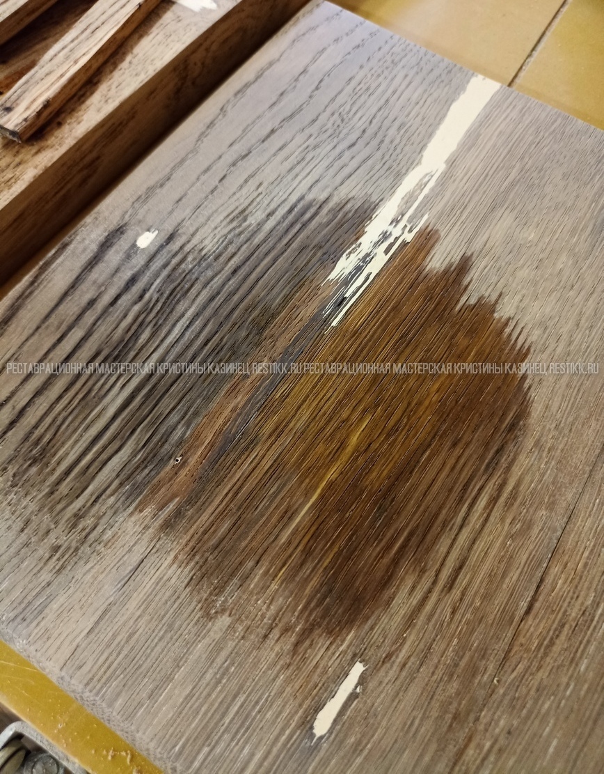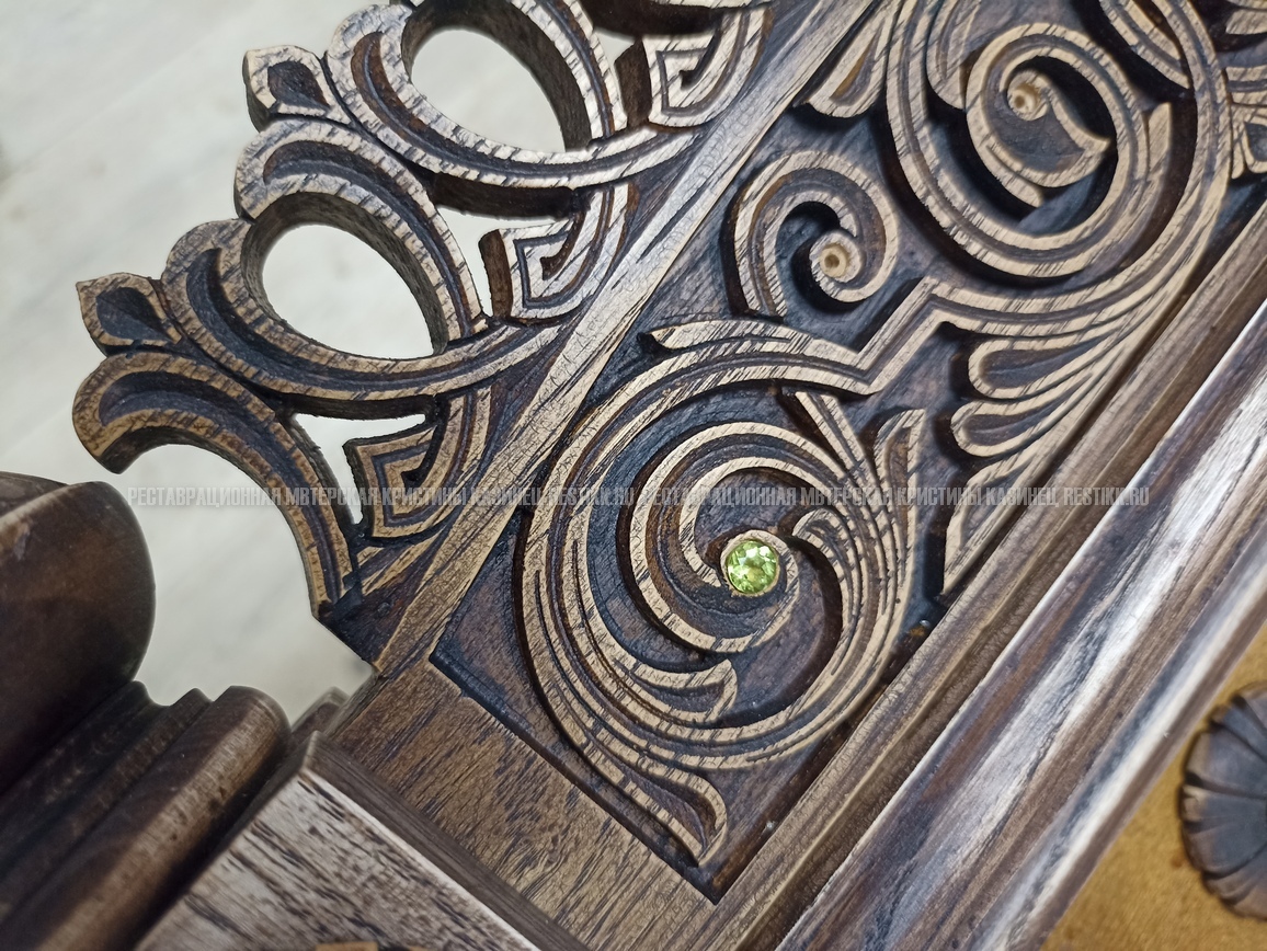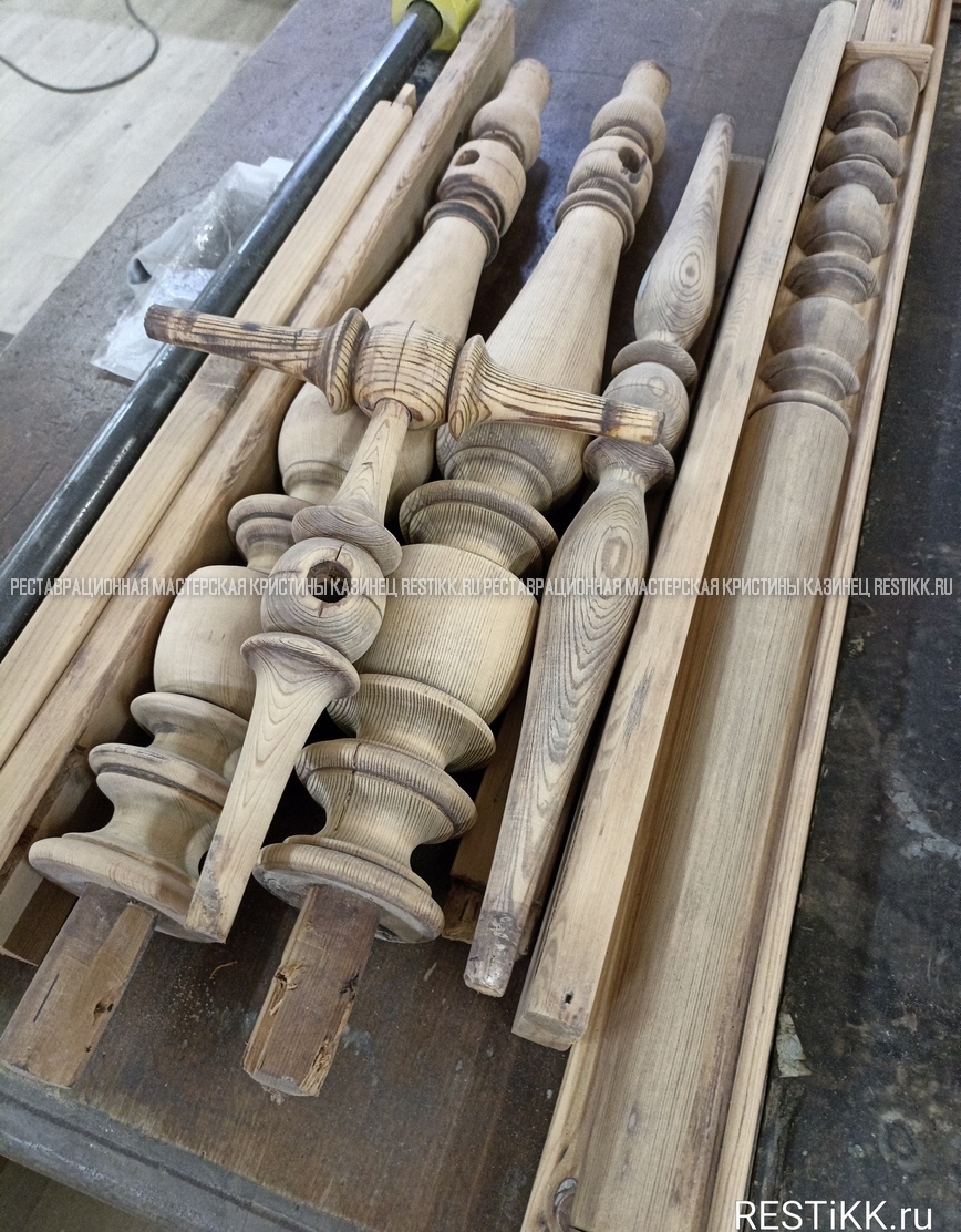 Старый шпон повсеместно отслаивался, сохранить его было невозможно. Поэтому работа предполагала полную перефанеровку всех плоскостей.