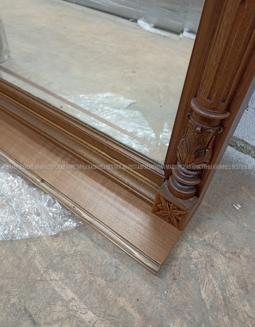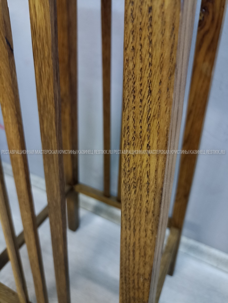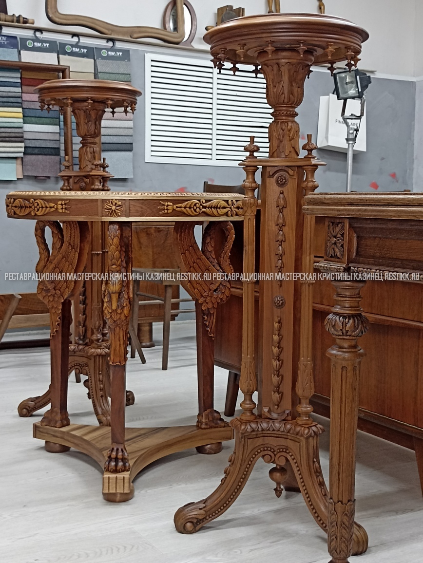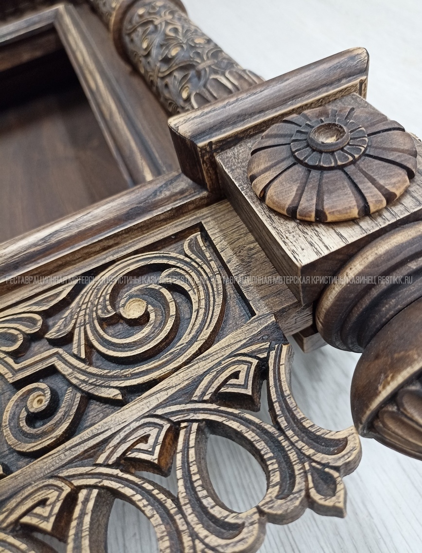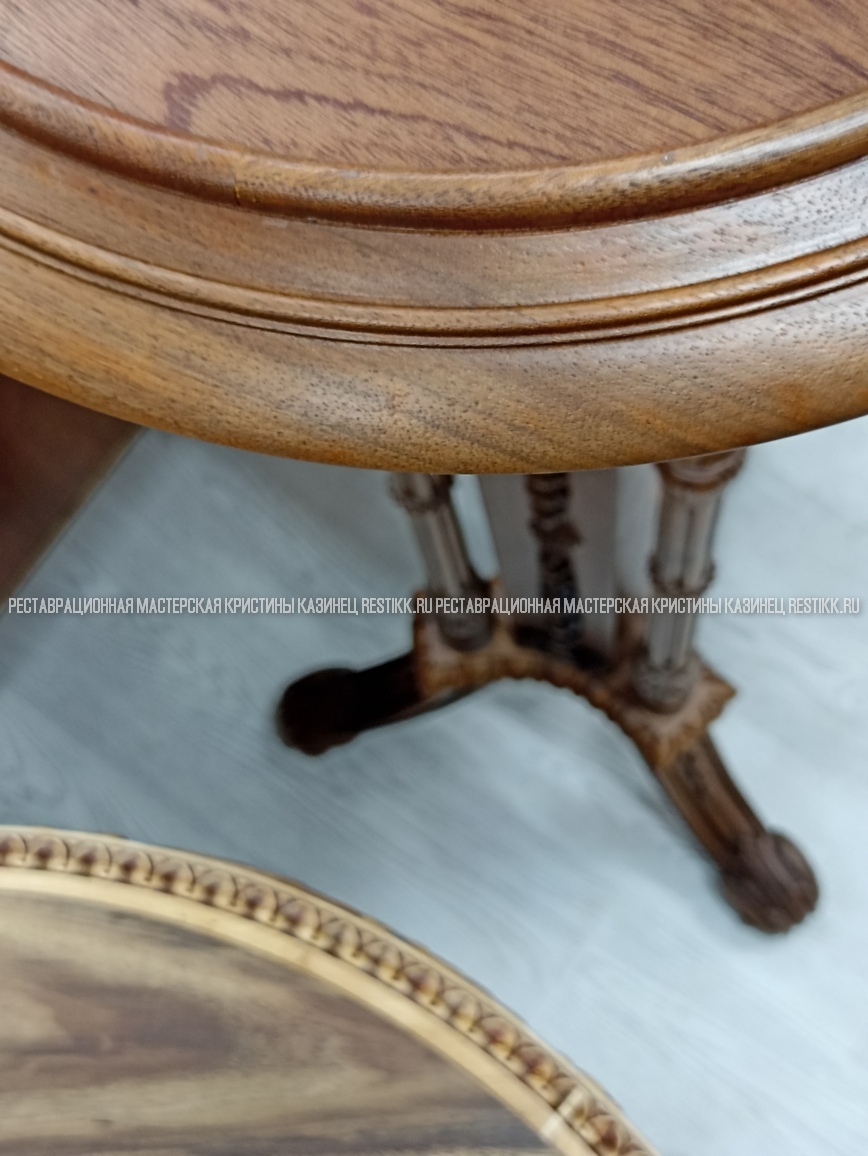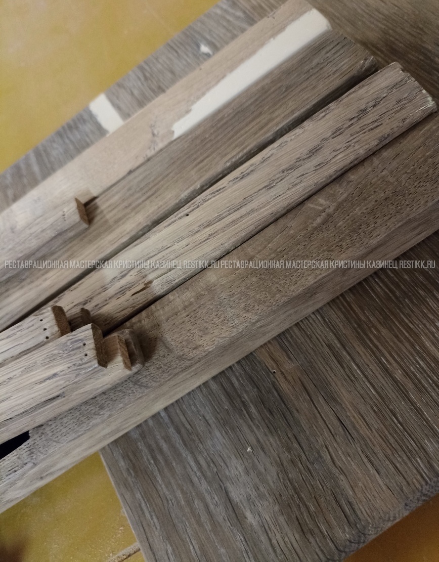 Старый шпон повсеместно отслаивался, сохранить его было невозможно. Поэтому работа предполагала полную перефанеровку всех плоскостей.