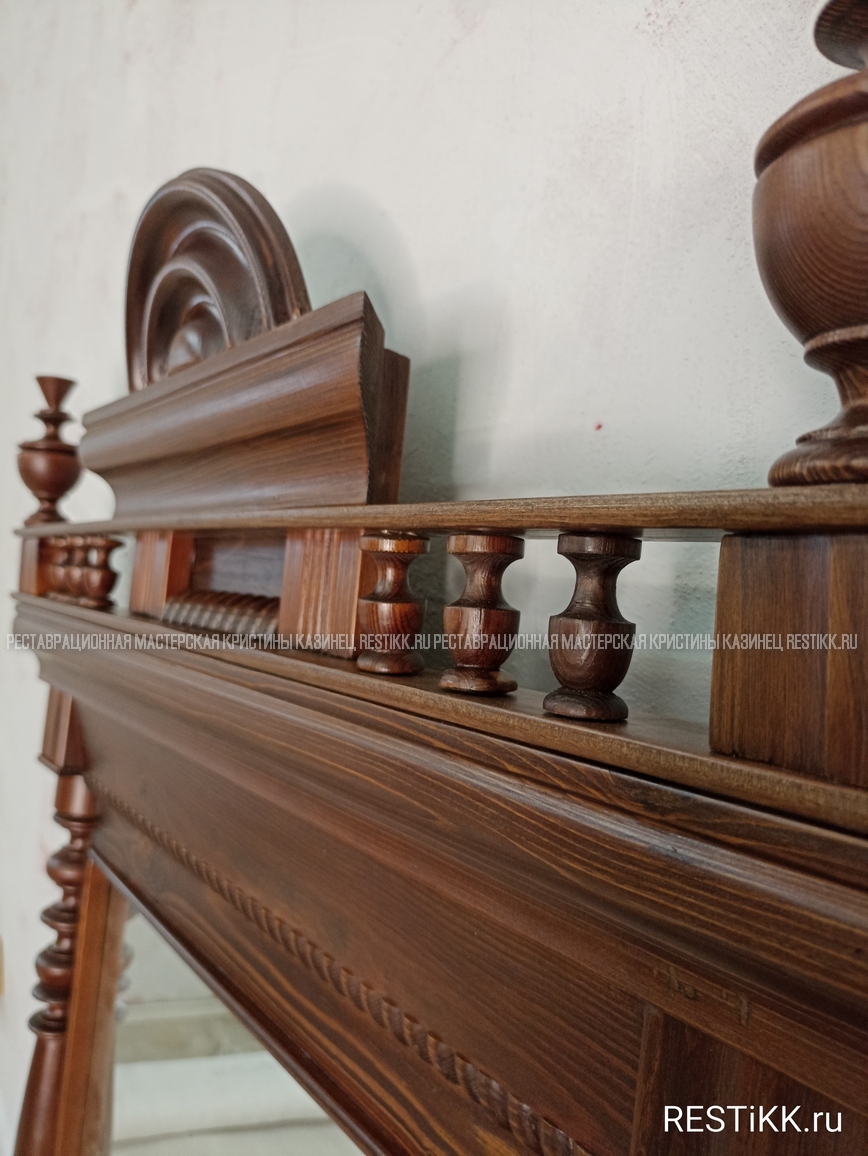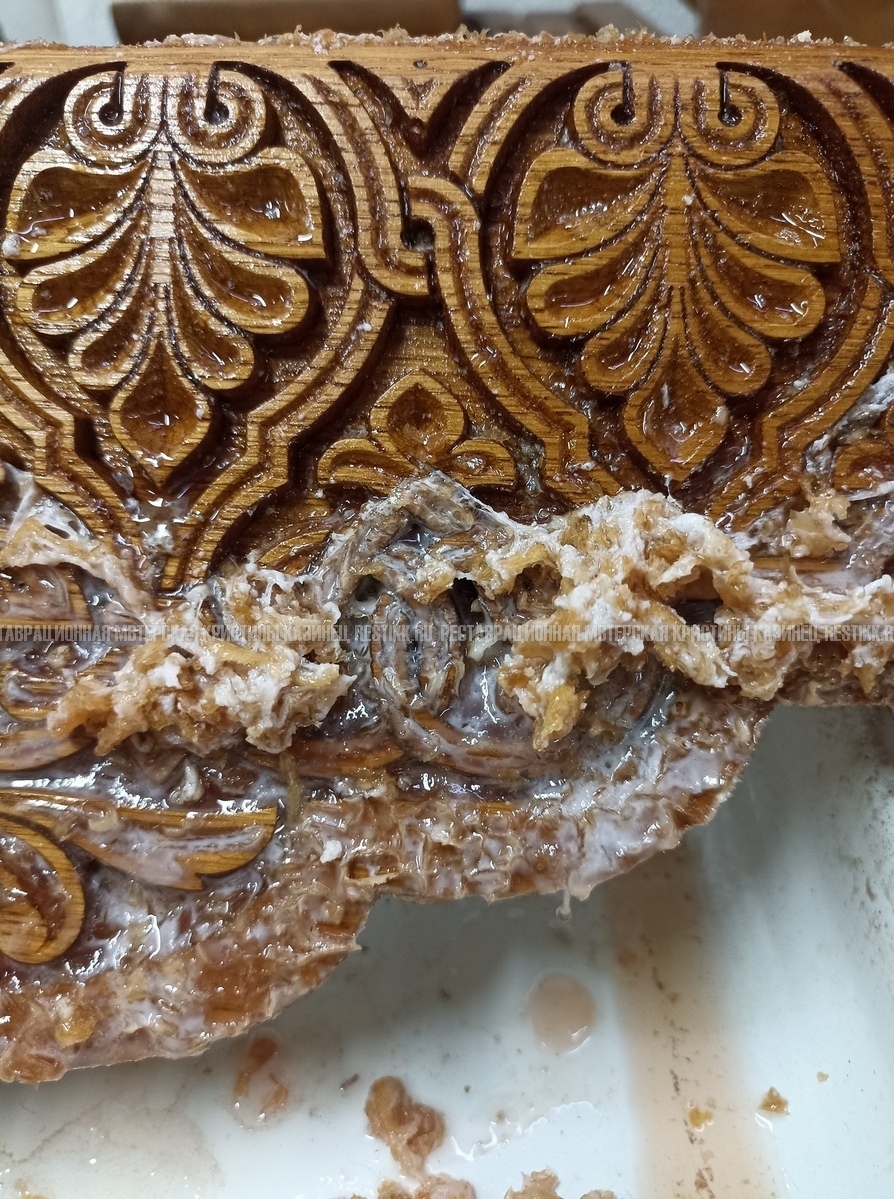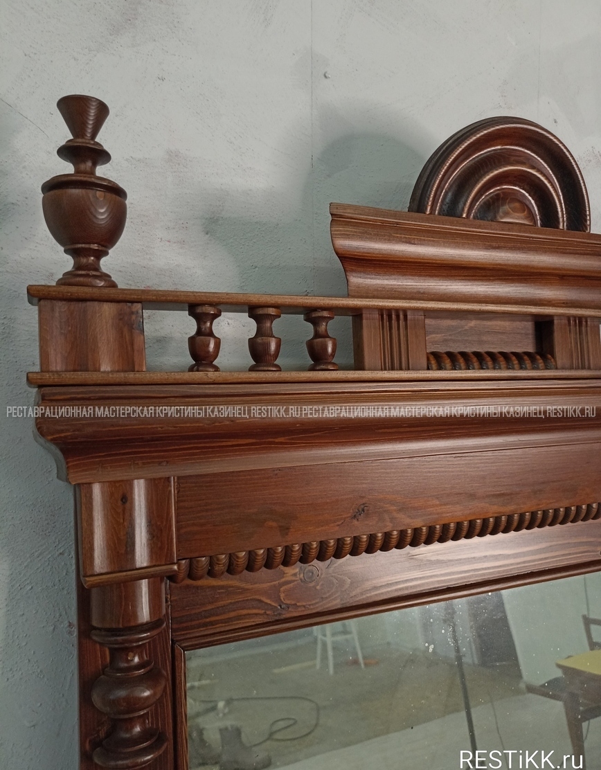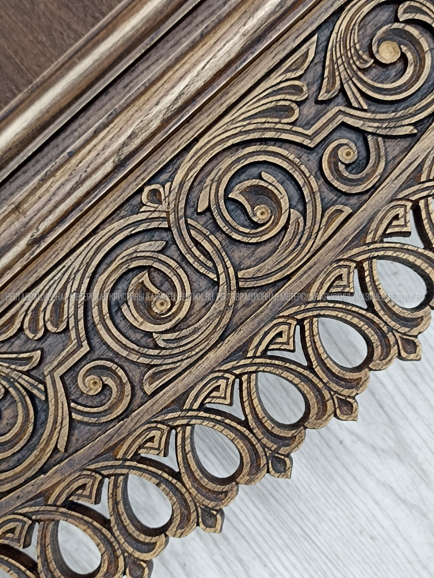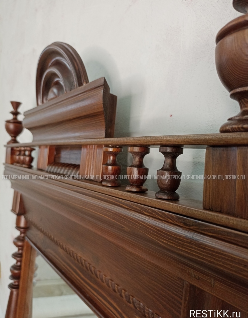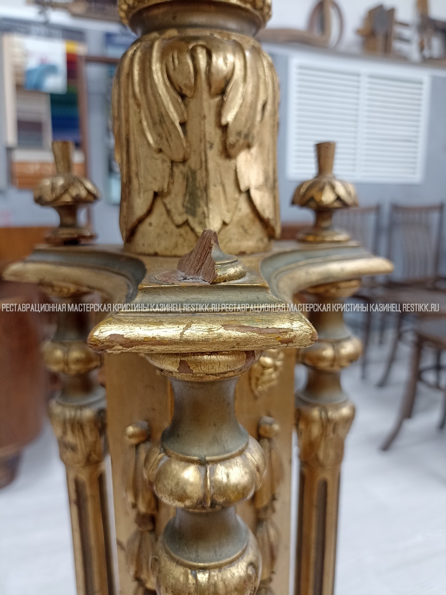Старый шпон повсеместно отслаивался, сохранить его было невозможно. Поэтому работа предполагала полную перефанеровку всех плоскостей.