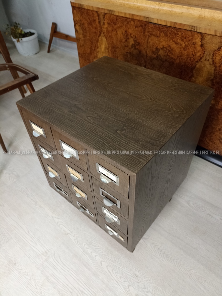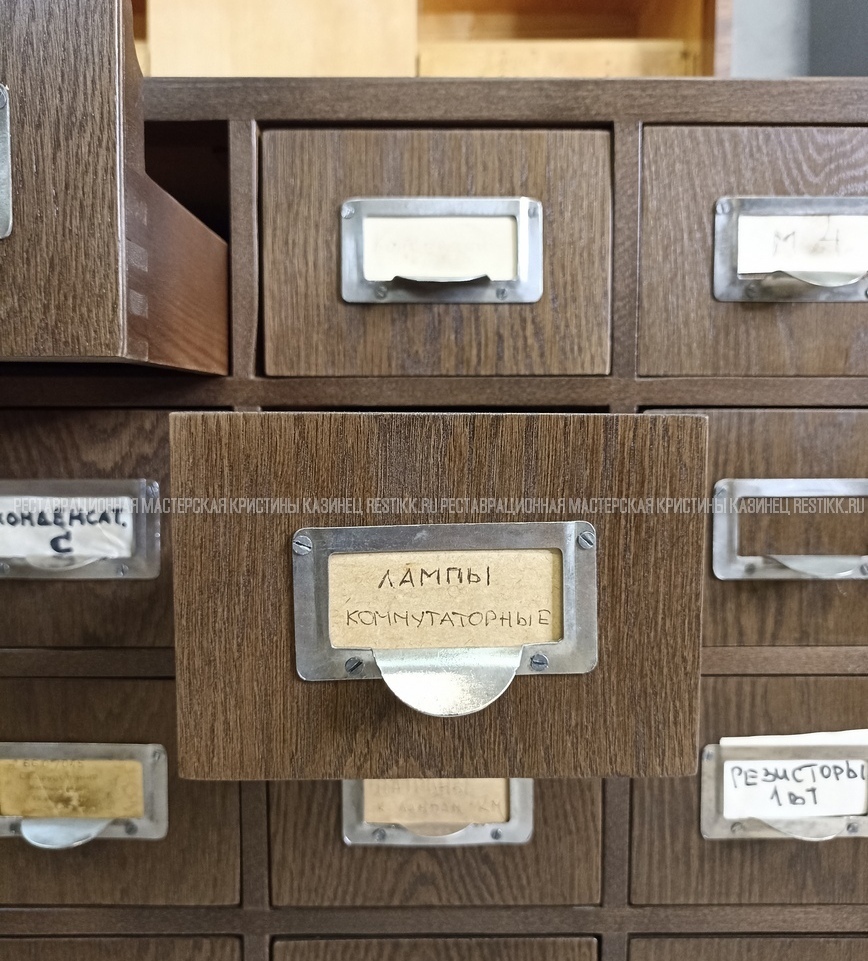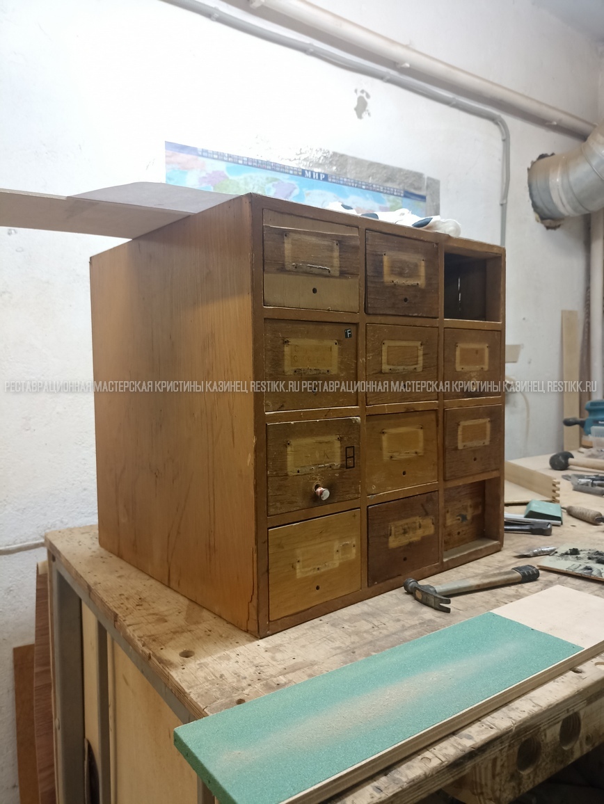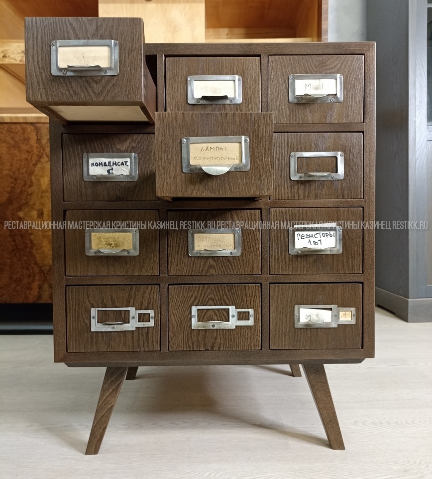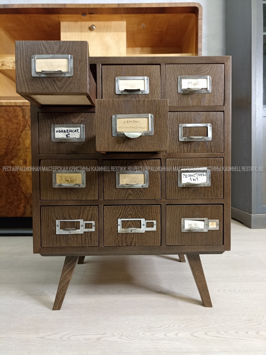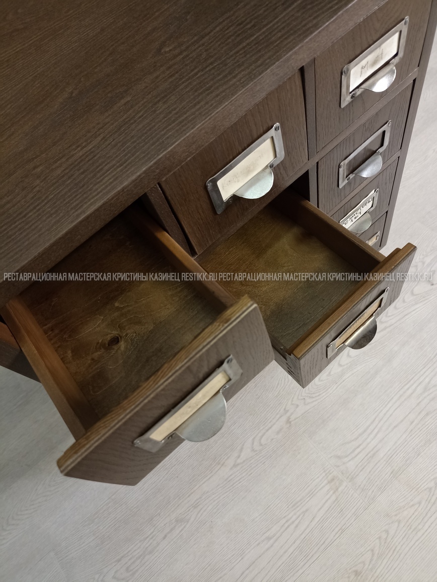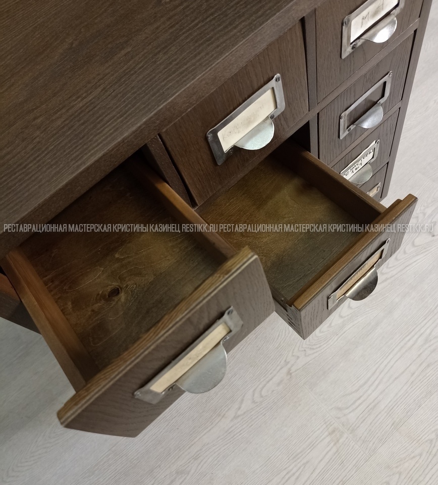 Задняя стенка отсутствовала, а вместо неё по заданию нужно было изготовить 4 фасада, закрывающихся на замок. Установлены латунные ножки на колесиках для удобства перемещения этого тяжелого красавца. Для открывания верхней крышки был установлен новый механизм.