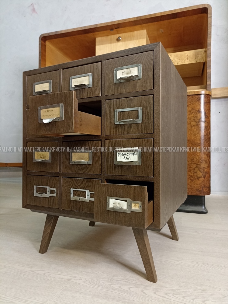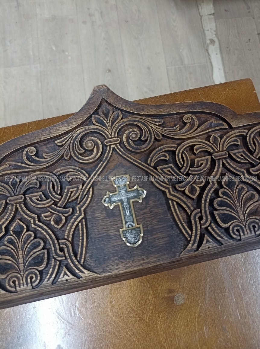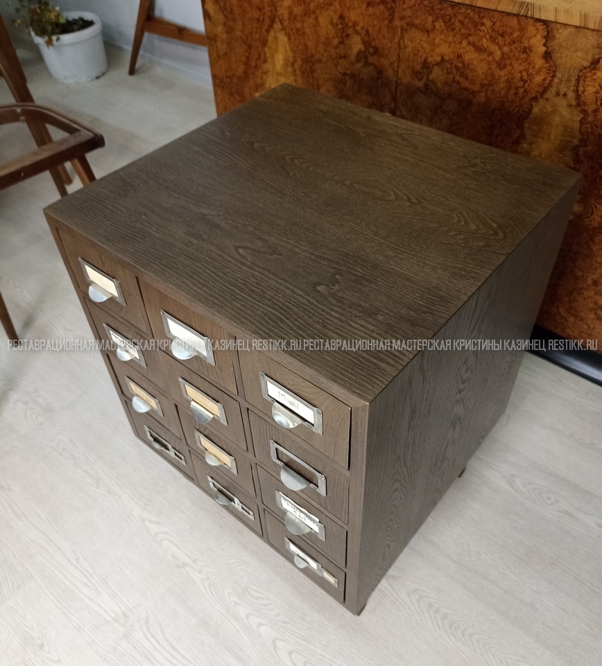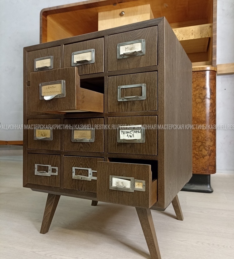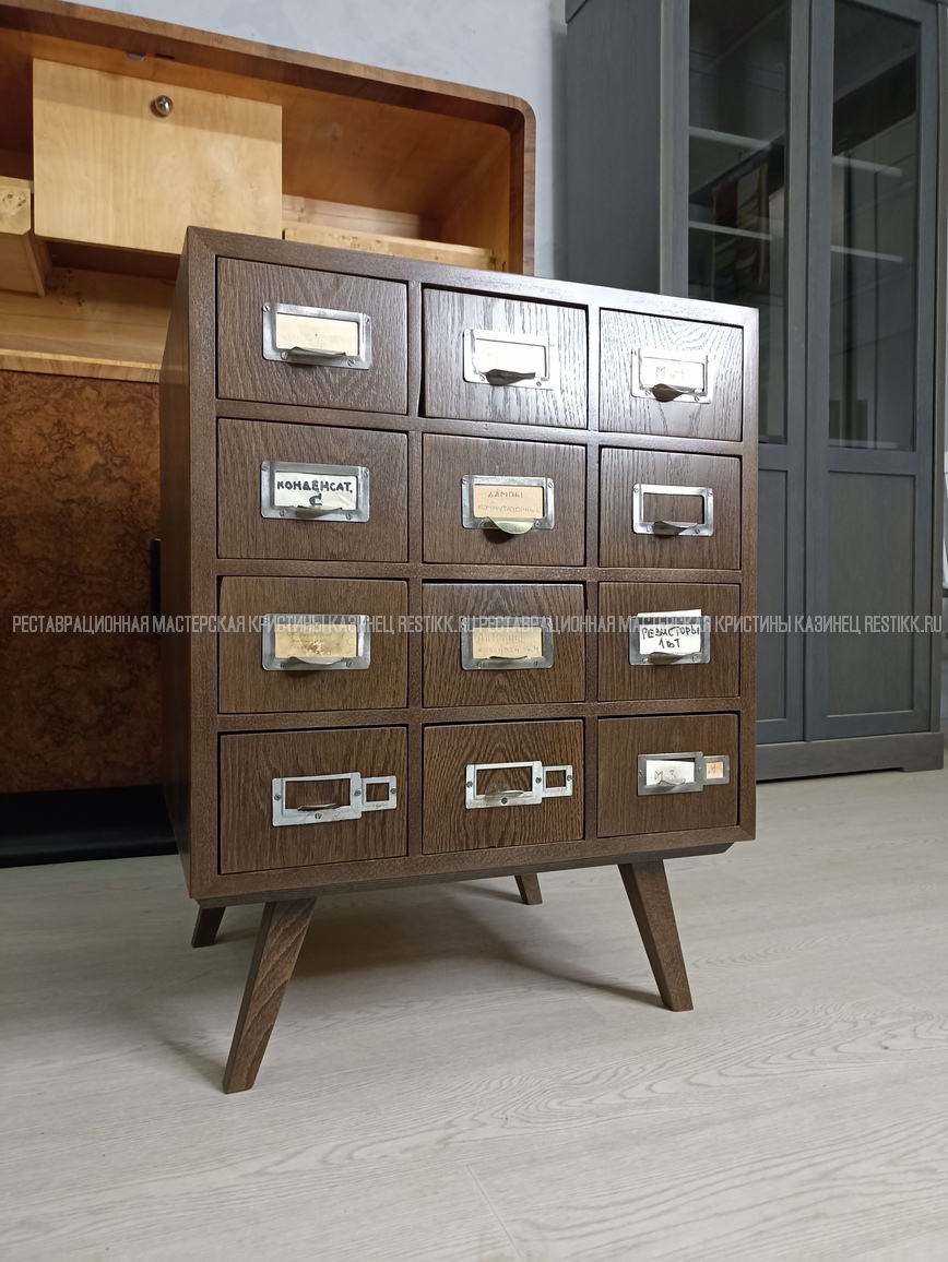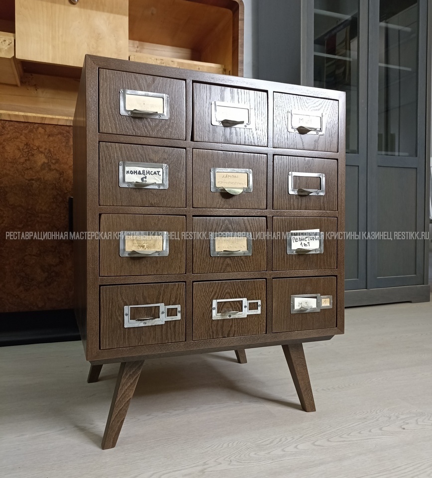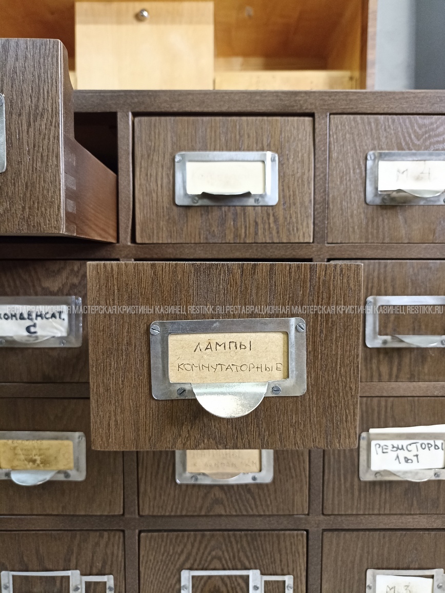 Задняя стенка отсутствовала, а вместо неё по заданию нужно было изготовить 4 фасада, закрывающихся на замок. Установлены латунные ножки на колесиках для удобства перемещения этого тяжелого красавца. Для открывания верхней крышки был установлен новый механизм.
